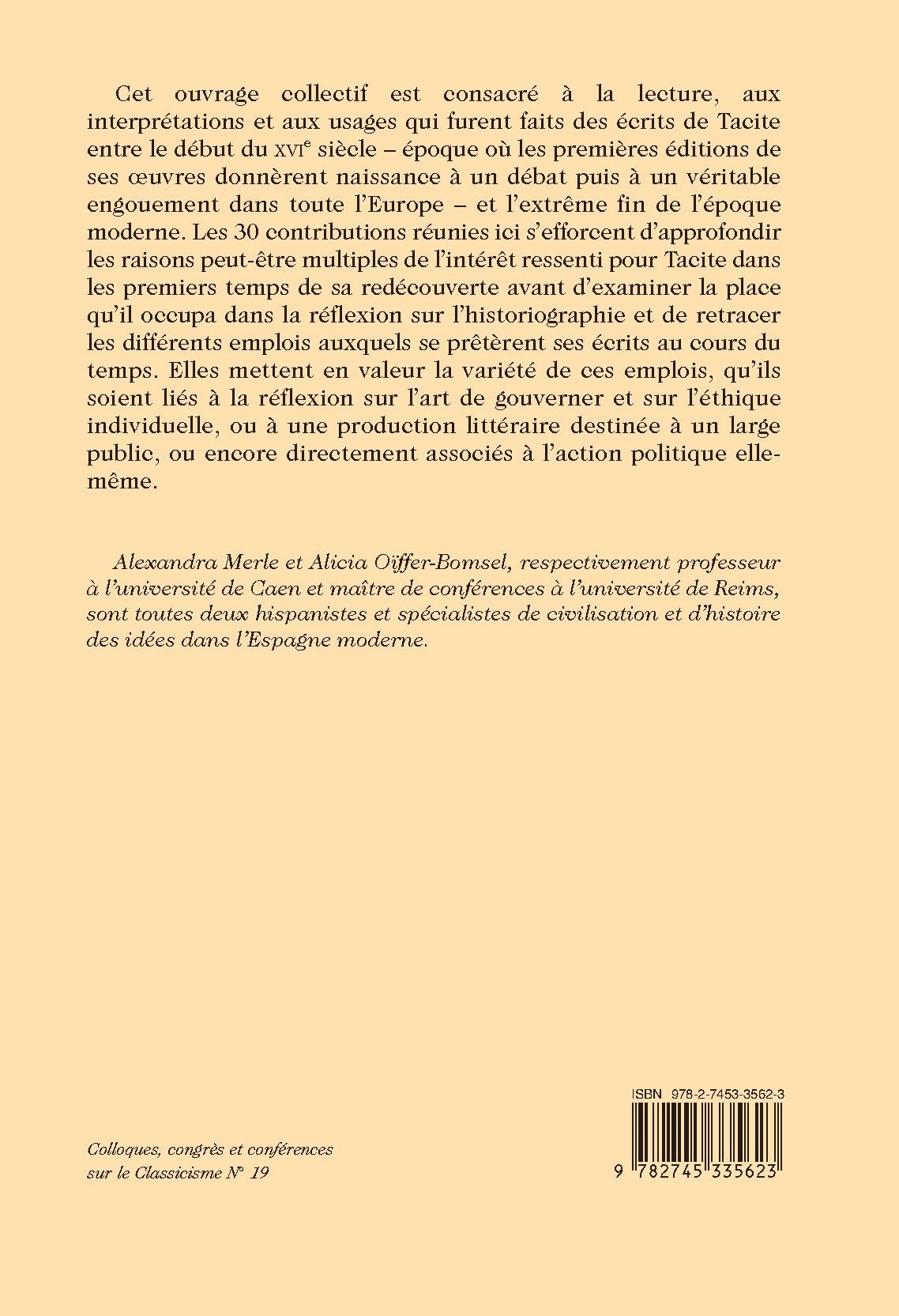Cet ouvrage collectif est consacré à la lecture, aux interprétations et aux usages qui furent faits des écrits de Tacite entre le début du XVIe siècle – époque où les premières éditions de ses œuvres donnèrent naissance à un débat puis à un véritable engouement dans toute l’Europe – et l’extrême fin de l’époque moderne. Les 30 contributions réunies ici s’efforcent d’approfondir les raisons peut-être multiples de l’intérêt ressenti pour Tacite dans les premiers temps de sa redécouverte avant d’examiner la place qu’il occupa dans la réflexion sur l’historiographie et de retracer les différents emplois auxquels se prêtèrent ses écrits au cours du temps. Elles mettent en valeur la variété de ces emplois, qu’ils soient liés à la réflexion sur l’art de gouverner et sur l’éthique individuelle, ou à une production littéraire destinée à un large public, ou encore directement associés à l’action politique elle-même.