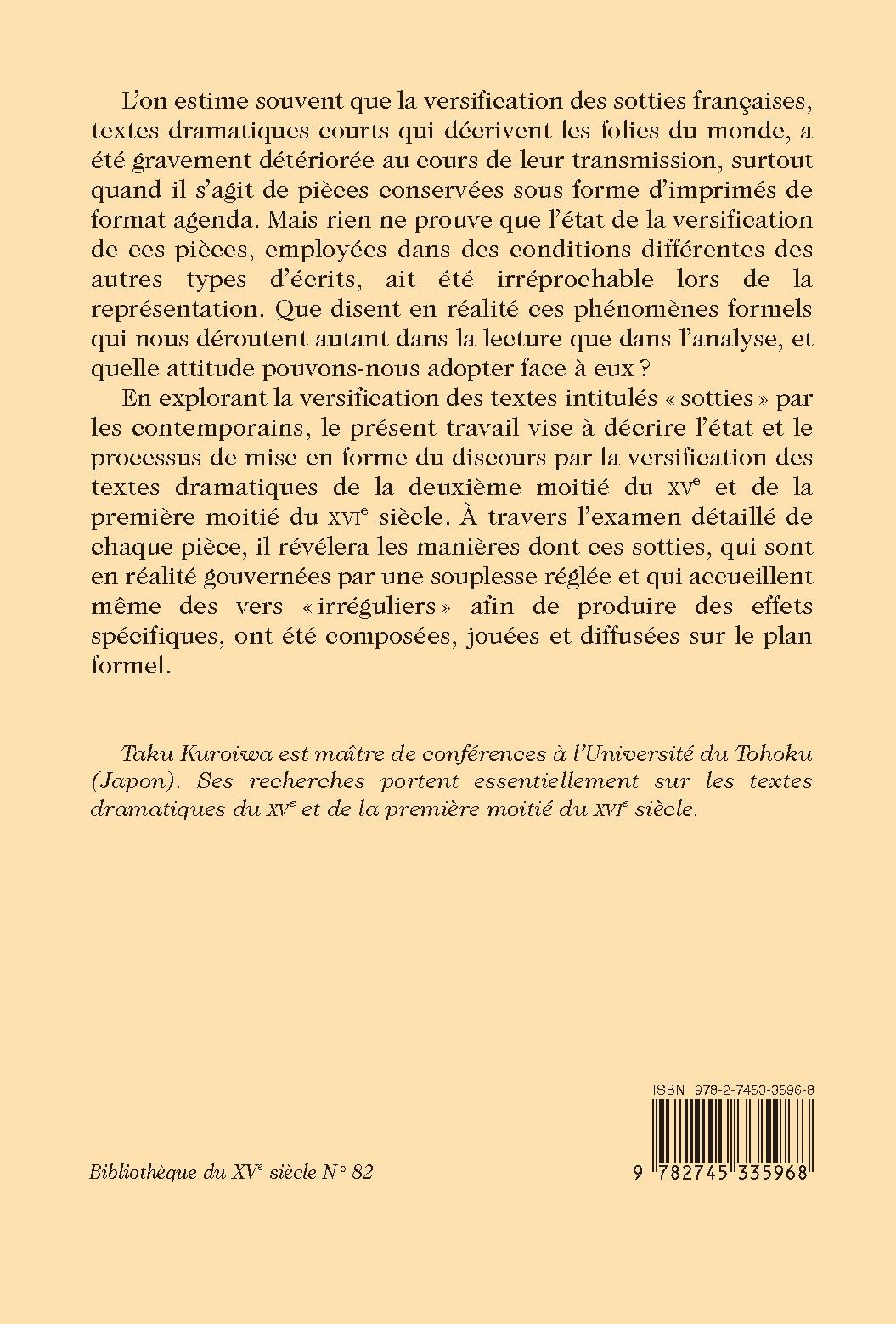 En explorant la versification des textes intitulés « sotties » par les contemporains, le présent travail vise à décrire l’état et le processus de mise en forme du discours par la versification des textes dramatiques de la deuxième moitié du XVe et de la première moitié du XVIe siècle. À travers l’examen détaillé de chaque pièce, il révélera les manières dont ces sotties, qui sont en réalité gouvernées par une souplesse réglée et qui accueillent même des vers « irréguliers » afin de produire des effets spécifiques, ont été composées, jouées et diffusées sur le plan formel.