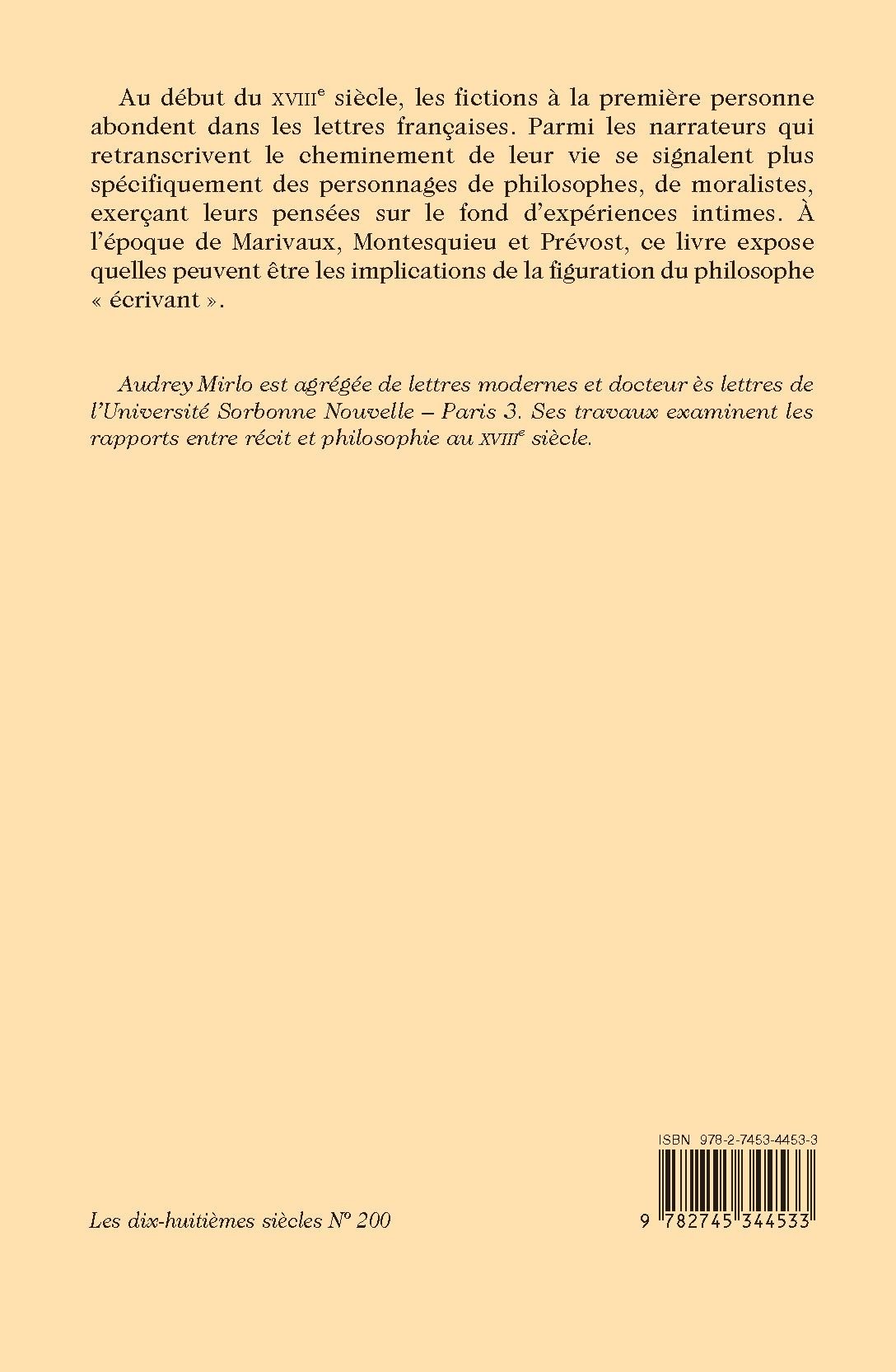 Au début du XVIIIe siècle, les fictions à la première personne abondent dans les lettres françaises. Parmi les narrateurs qui retranscrivent le cheminement de leur vie se signalent plus spécifiquement des personnages de philosophes, de moralistes, exerçant leurs pensées sur le fond d’expériences intimes. À l’époque de Marivaux, Montesquieu et Prévost, ce livre expose quelles peuvent être les implications de la figuration du philosophe « écrivant ».