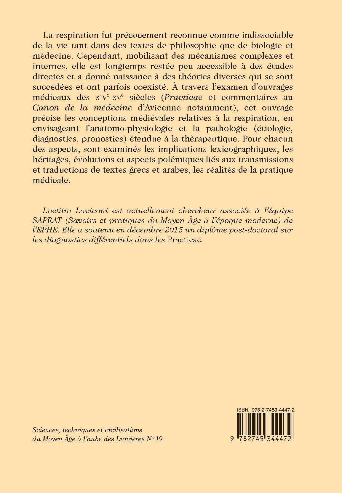 La respiration fut précocement reconnue comme indissociable de la vie tant dans des textes de philosophie que de biologie et médecine. Cependant, mobilisant des mécanismes complexes et internes, elle est longtemps restée peu accessible à des études directes et a donné naissance à des théories diverses qui se sont succédées et ont parfois coexisté. À travers l’examen d’ouvrages médicaux des XIVe-XVe siècles (Practicae et commentaires au Canon de la médecine d’Avicenne notamment), cet ouvrage précise les conceptions médiévales relatives à la respiration, en envisageant l’anatomo-physiologie et la pathologie (étiologie, diagnostics, pronostics) étendue à la thérapeutique. Pour chacun des aspects, sont examinés les implications lexicographiques, les héritages, évolutions et aspects polémiques liés aux transmissions et traductions de textes grecs et arabes, les réalités de la pratique médicale.