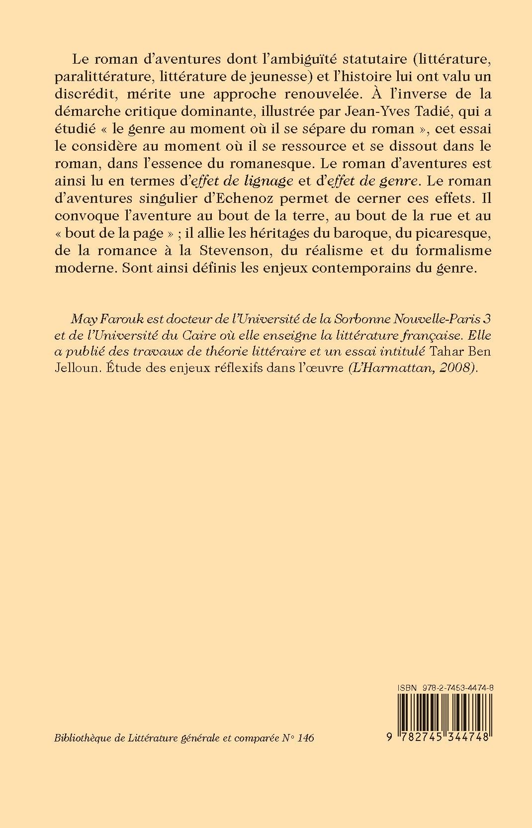 Le roman d’aventures dont l’ambiguïté statutaire (littérature, paralittérature, littérature de jeunesse) et l’histoire lui ont valu un discrédit, mérite une approche renouvelée. À l’inverse de la démarche critique dominante, illustrée par Jean-Yves Tadié, qui a étudié « le genre au moment où il se sépare du roman », cet essai le considère au moment où il se ressource et se dissout dans le roman, dans l’essence du romanesque. Le roman d’aventures est ainsi lu en termes d’effet de lignage et d’effet de genre. Le roman d’aventures singulier d’Echenoz permet de cerner ces effets. Il convoque l’aventure au bout de la terre, au bout de la rue et au « bout de la page » ; il allie les héritages du baroque, du picaresque, de la romance à la Stevenson, du réalisme et du formalisme moderne. Sont ainsi définis les enjeux contemporains du genre.