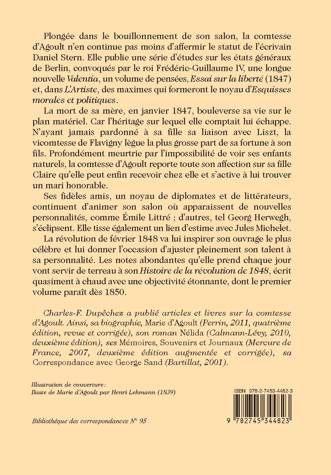 Plongée dans le bouillonnement de son salon, la comtesse d’Agoult n’en continue pas moins d’affermir le statut de l’écrivain Daniel Stern. Elle publie une série d’études sur les états généraux de Berlin, convoqués par le roi Frédéric-Guillaume IV, une longue nouvelle Valentia, un volume de pensées, Essai sur la liberté (1847) et, dans L’Artiste, des maximes qui formeront le noyau d’Esquisses morales et politiques.