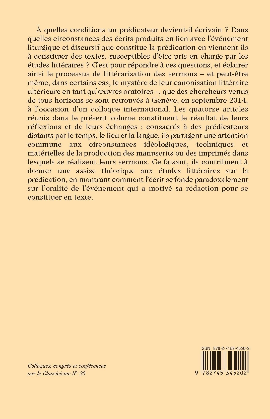 À quelles conditions un prédicateur devient-il écrivain ? Dans quelles circonstances des écrits produits en lien avec l’événement liturgique et discursif que constitue la prédication en viennent-ils à constituer des textes, susceptibles d’être pris en charge par les études littéraires ? C’est pour répondre à ces questions, et éclairer ainsi le processus de littérarisation des sermons – et peut-être même, dans certains cas, le mystère de leur canonisation littéraire ultérieure en tant qu’œuvres oratoires –, que des chercheurs venus de tous horizons se sont retrouvés à Genève, en septembre 2014, à l’occasion d’un colloque international. Les quatorze articles réunis dans le présent volume constituent le résultat de leurs réflexions et de leurs échanges : consacrés à des prédicateurs distants par le temps, le lieu et la langue, ils partagent une attention commune aux circonstances idéologiques, techniques et matérielles de la production des manuscrits ou des imprimés dans lesquels se réalisent leurs sermons. Ce faisant, ils contribuent à donner une assise théorique aux études littéraires sur la prédication, en montrant comment l’écrit se fonde paradoxalement sur l’oralité de l’événement qui a motivé sa rédaction pour se constituer en texte.