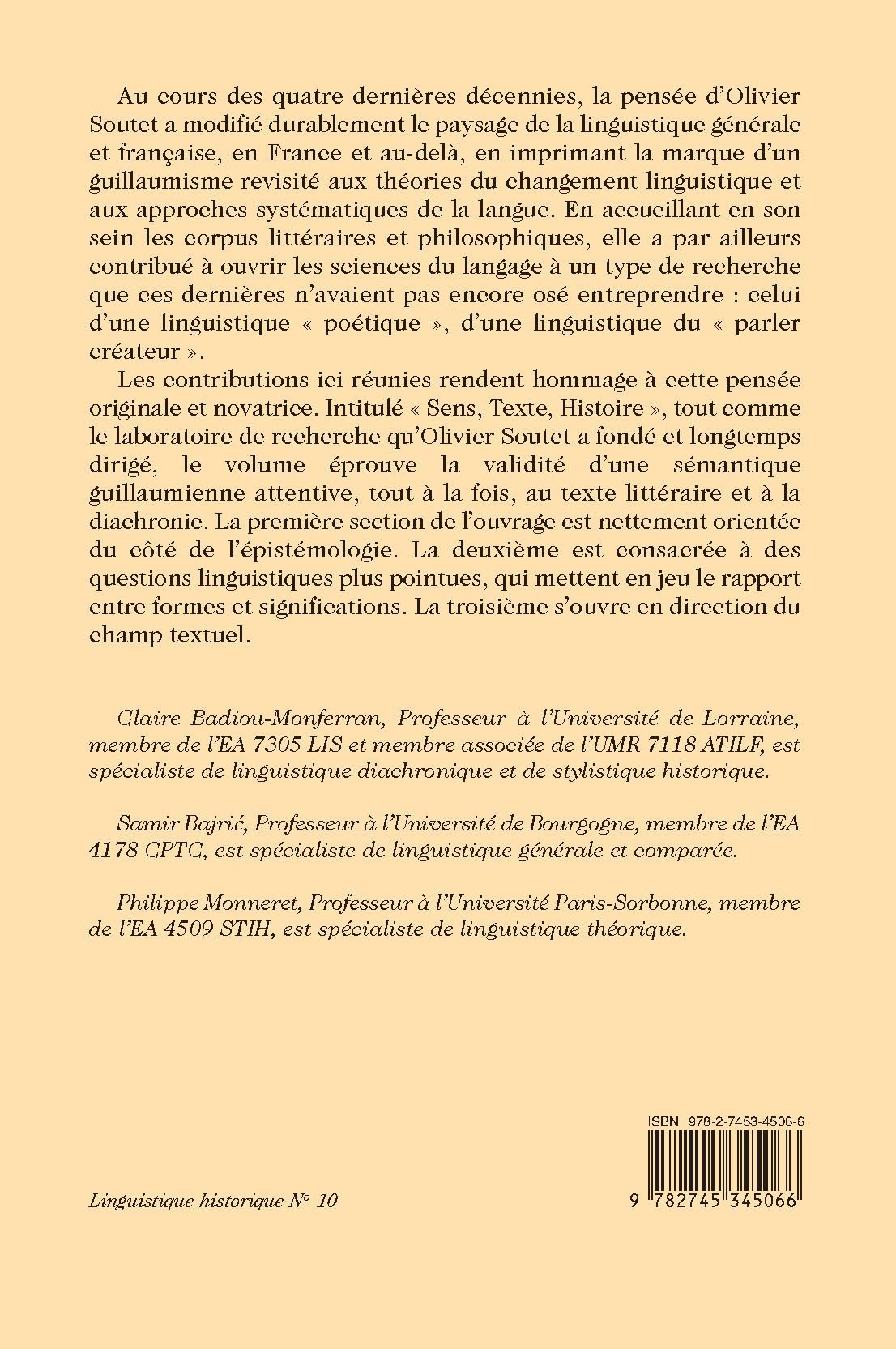 Les contributions ici réunies rendent hommage à cette pensée originale et novatrice. Intitulé « Sens, Texte, Histoire », tout comme le laboratoire de recherche qu’Olivier Soutet a fondé et longtemps dirigé, le volume éprouve la validité d’une sémantique guillaumienne attentive, tout à la fois, au texte littéraire et à la diachronie. La première section de l’ouvrage est nettement orientée du côté de l’épistémologie. La deuxième est consacrée à des questions linguistiques plus pointues, qui mettent en jeu le rapport entre formes et significations. La troisième s’ouvre en direction du champ textuel.