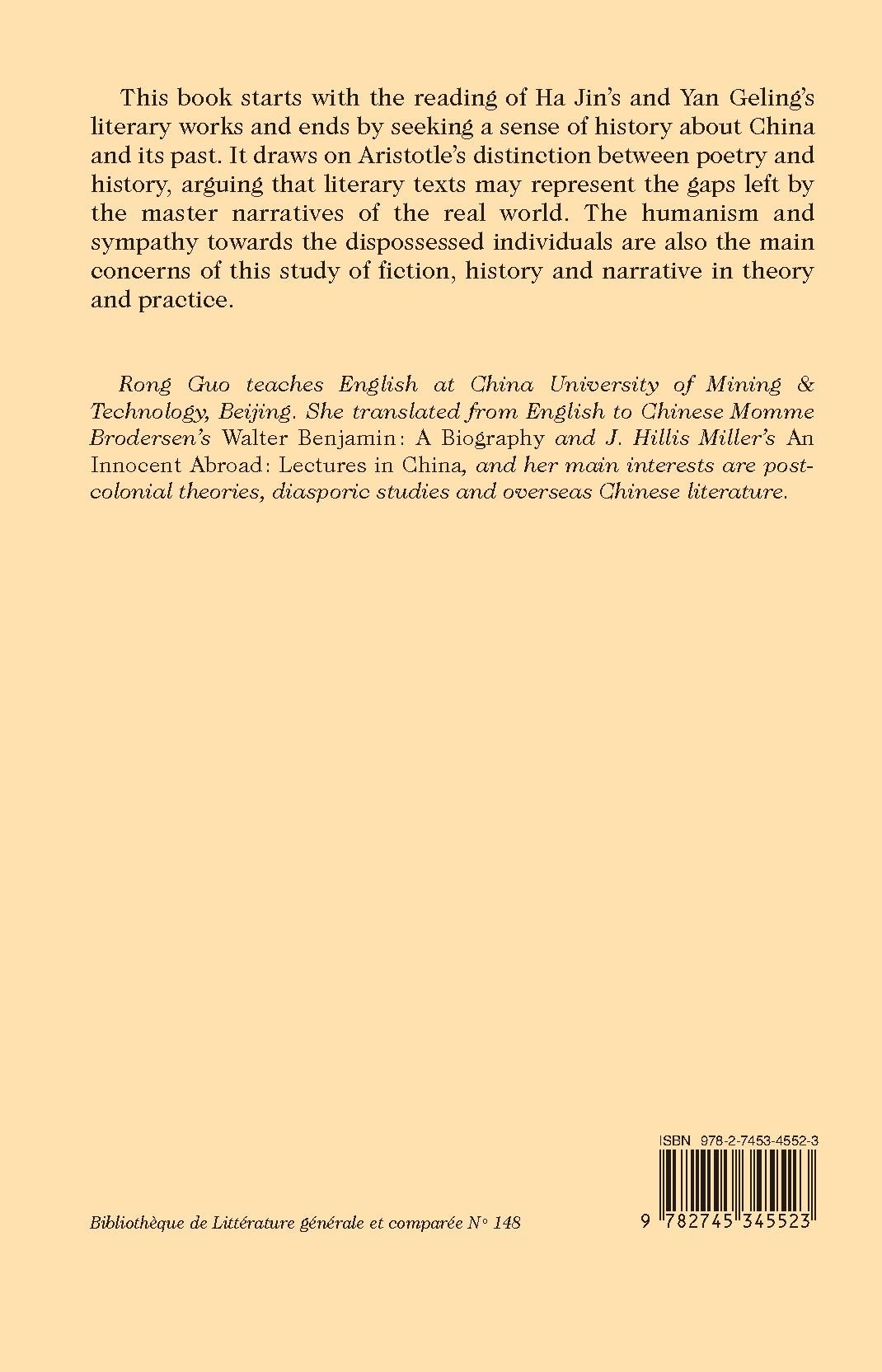 This book starts with the reading of Ha Jin’s and Yan Geling’s literary works and ends by seeking a sense of history about China and its past. It draws on Aristotle’s distinction between poetry and history, arguing that literary texts may represent the gaps left by the master narratives of the real world. The humanism and sympathy towards the dispossessed individuals are also the main concerns of this study of fiction, history and narrative in theory and practice.