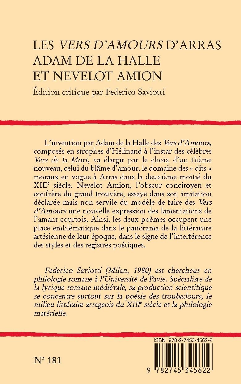 L’invention par Adam de la Halle des Vers d’Amours, composés en strophes d’Hélinand à l’instar des célèbres Vers de la Mort, va élargir par le choix d’un thème nouveau, celui du blâme d’amour, le domaine des « dits » moraux en vogue à Arras dans la deuxième moitié du XIIIe siècle. Nevelot Amion, l’obscur concitoyen et confrère du grand trouvère, essaye dans son imitation déclarée mais non servile du modèle de faire des Vers d’Amours une nouvelle expression des lamentations de l’amant courtois. Ainsi, les deux poèmes occupent une place emblématique dans le panorama de la littérature artésienne de leur époque, dans le signe de l’interférence des styles et des registres poétiques.