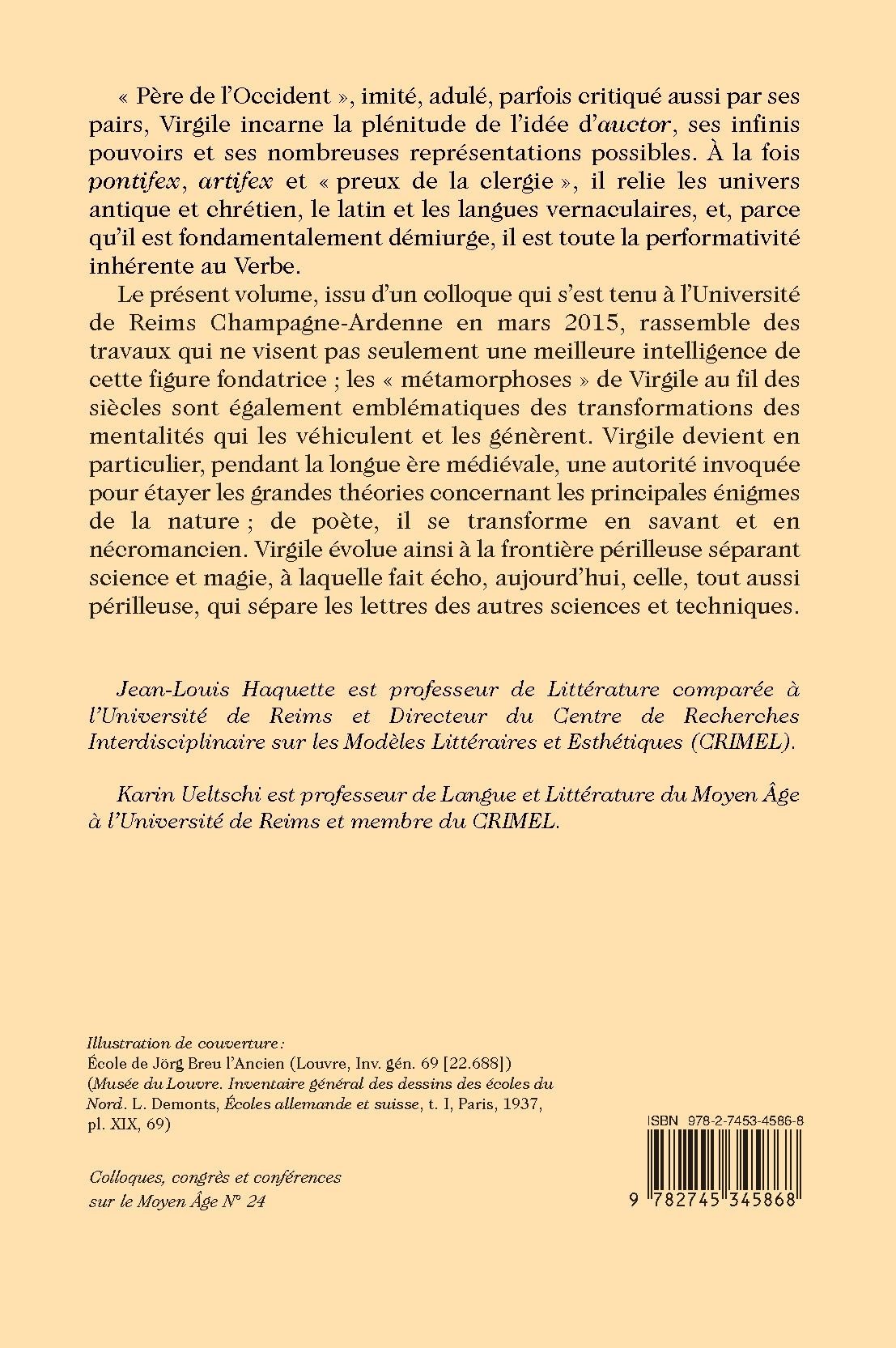 « Père de l’Occident », imité, adulé, parfois critiqué aussi par ses pairs, Virgile incarne la plénitude de l’idée d’auctor, ses infinis pouvoirs et ses nombreuses représentations possibles. À la fois pontifex, artifex et « preux de la clergie », il relie les univers antique et chrétien, le latin et les langues vernaculaires, et, parce qu’il est fondamentalement démiurge, il est toute la performativité inhérente au Verbe.