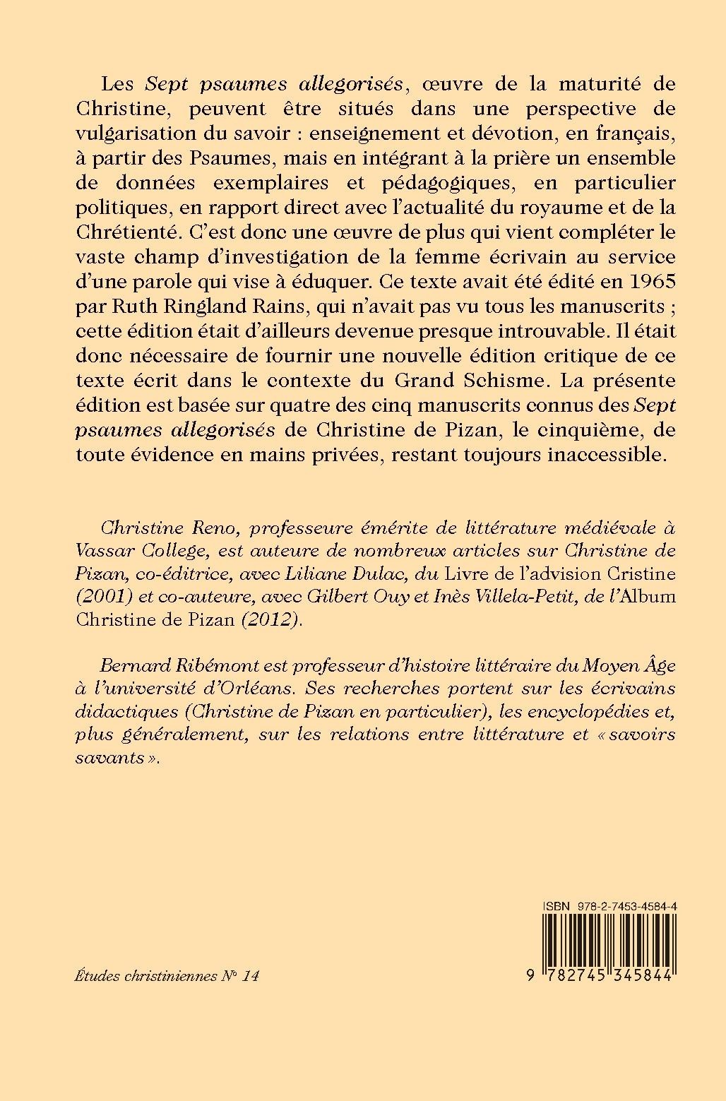 Les Sept psaumes allegorisés, oeuvre de la maturité de Christine, peuvent être situés dans une perspective de vulgarisation du savoir : enseignement et dévotion, en français, à partir des Psaumes, mais en intégrant à la prière un ensemble de données exemplaires et pédagogiques, en particulier politiques, en rapport direct avec l’actualité du royaume et de la Chrétienté. C’est donc une oeuvre de plus qui vient compléter le vaste champ d’investigation de la femme écrivain au service d’une parole qui vise à éduquer. Ce texte avait été édité en 1965 par Ruth Ringland Rains, qui n’avait pas vu tous les manuscrits ; cette édition était d’ailleurs devenue presque introuvable. Il était donc nécessaire de fournir une nouvelle édition critique de ce texte écrit dans le contexte du Grand Schisme. La présente édition est basée sur quatre des cinq manuscrits connus des Sept psaumes allegorisés de Christine de Pizan, le cinquième, de toute évidence en mains privées, restant toujours inaccessible.