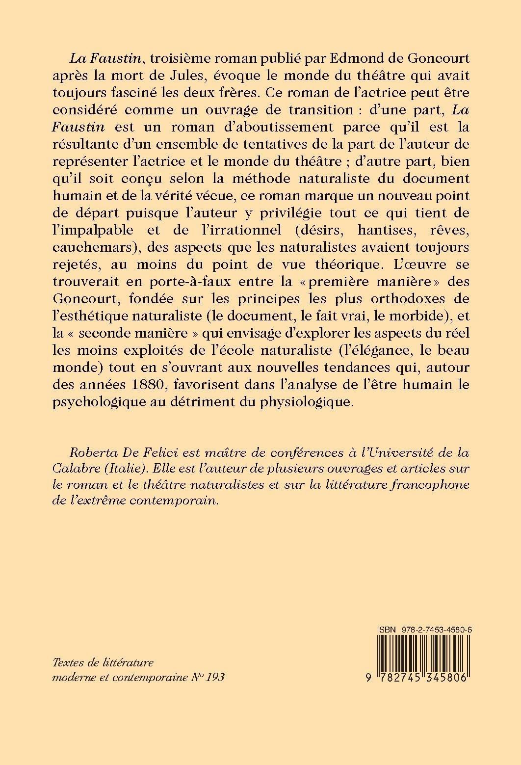 La Faustin, troisième roman publié par Edmond de Goncourt après la mort de Jules, évoque le monde du théâtre qui avait toujours fasciné les deux frères. Ce roman de l’actrice peut être considéré comme un ouvrage de transition : d’une part, La Faustin est un roman d’aboutissement parce qu’il est la résultante d’un ensemble de tentatives de la part de l’auteur de représenter l’actrice et le monde du théâtre ; d’autre part, bien qu’il soit conçu selon la méthode naturaliste du document humain et de la vérité vécue, ce roman marque un nouveau point de départ puisque l’auteur y privilégie tout ce qui tient de l’impalpable et de l’irrationnel (désirs, hantises, rêves, cauchemars), des aspects que les naturalistes avaient toujours rejetés, au moins du point de vue théorique. L’oeuvre se trouverait en porte-à-faux entre la « première manière » des Goncourt, fondée sur les principes les plus orthodoxes de l’esthétique naturaliste (le document, le fait vrai, le morbide), et la « seconde manière » qui envisage d’explorer les aspects du réel les moins exploités de l’école naturaliste (l’élégance, le beau monde) tout en s’ouvrant aux nouvelles tendances qui, autour des années 1880, favorisent dans l’analyse de l’être humain le psychologique au détriment du physiologique.