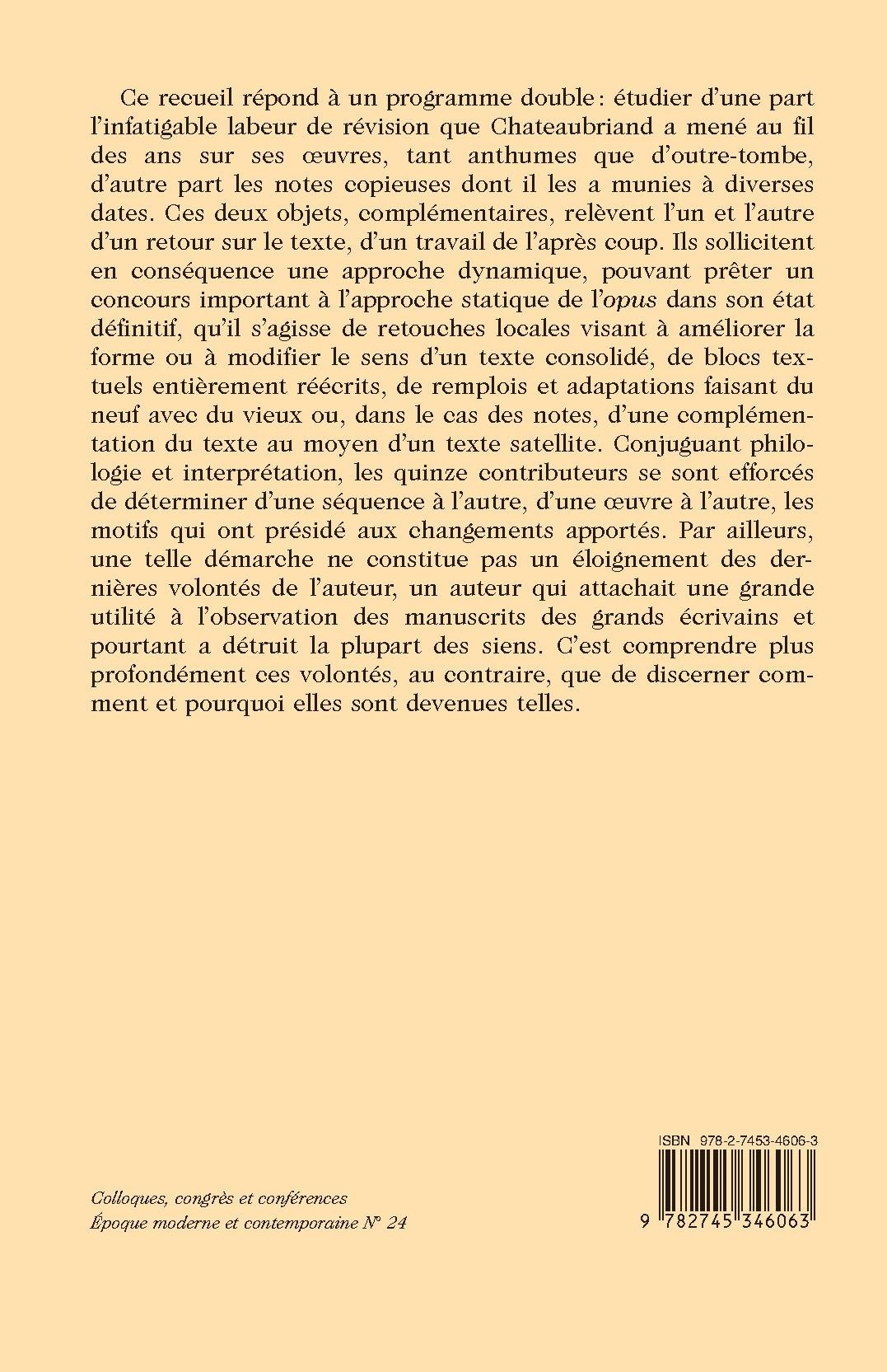 Ce recueil répond à un programme double : étudier d’une part l’infatigable labeur de révision que Chateaubriand a mené au fil des ans sur ses œuvres, tant anthumes que d’outre-tombe, d’autre part les notes copieuses dont il les a munies à diverses dates. Ces deux objets, complémentaires, relèvent l’un et l’autre d’un retour sur le texte, d’un travail de l’après coup. Ils sollicitent en conséquence une approche dynamique, pouvant prêter un concours important à l’approche statique de l’opus dans son état définitif, qu’il s’agisse de retouches locales visant à améliorer la forme ou à modifier le sens d’un texte consolidé, de blocs textuels entièrement réécrits, de remplois et adaptations faisant du neuf avec du vieux ou, dans le cas des notes, d’une complémentation du texte au moyen d’un texte satellite. Conjuguant philologie et interprétation, les quinze contributeurs se sont efforcés de déterminer d’une séquence à l’autre, d’une oeuvre à l’autre, les motifs qui ont présidé aux changements apportés. Par ailleurs, une telle démarche ne constitue pas un éloignement des dernières volontés de l’auteur, un auteur qui attachait une grande utilité à l’observation des manuscrits des grands écrivains et pourtant a détruit la plupart des siens. C’est comprendre plus profondément ces volontés, au contraire, que de discerner comment et pourquoi elles sont devenues telles.