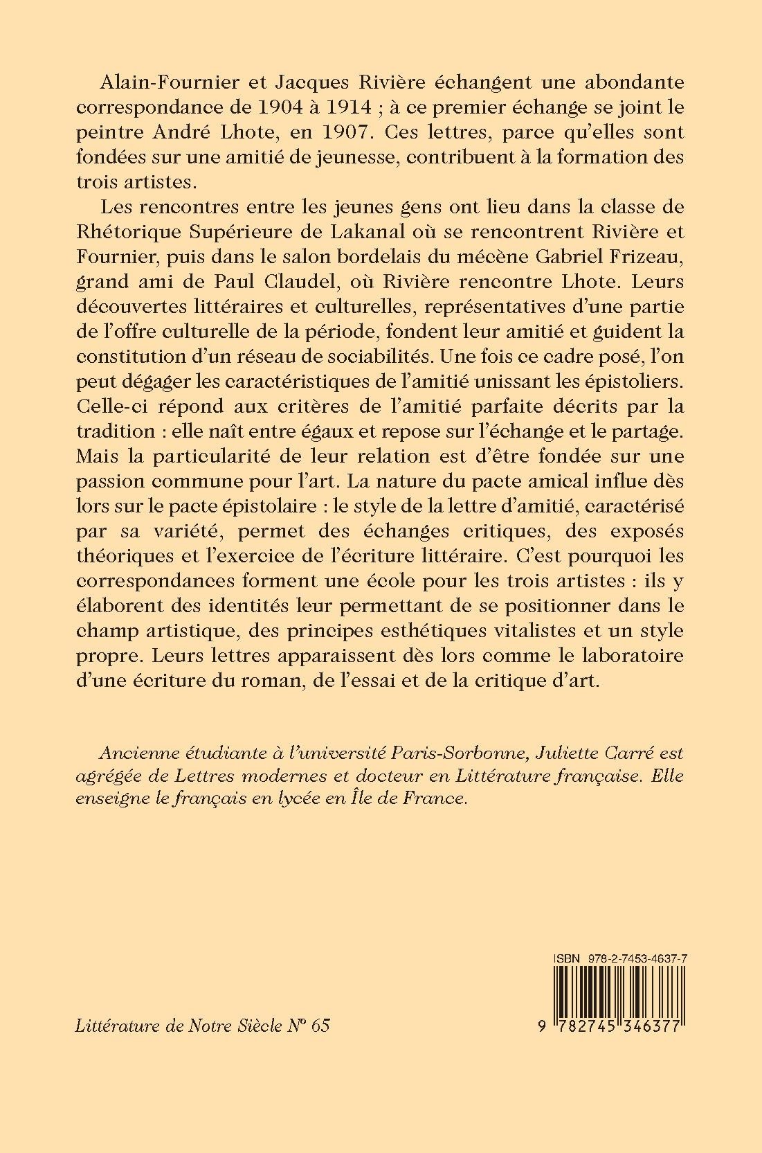 Les rencontres entre les jeunes gens ont lieu dans la classe de Rhétorique Supérieure de Lakanal où se rencontrent Rivière et Fournier, puis dans le salon bordelais du mécène Gabriel Frizeau, grand ami de Paul Claudel, où Rivière rencontre Lhote. Leurs découvertes littéraires et culturelles, représentatives d’une partie de l’offre culturelle de la période, fondent leur amitié et guident la constitution d’un réseau de sociabilités. Une fois ce cadre posé, l’on peut dégager les caractéristiques de l’amitié unissant les épistoliers. Celle-ci répond aux critères de l’amitié parfaite décrits par la tradition : elle naît entre égaux et repose sur l’échange et le partage. Mais la particularité de leur relation est d’être fondée sur une passion commune pour l’art. La nature du pacte amical influe dès lors sur le pacte épistolaire : le style de la lettre d’amitié, caractérisé par sa variété, permet des échanges critiques, des exposés théoriques et l’exercice de l’écriture littéraire. C’est pourquoi les correspondances forment une école pour les trois artistes : ils y élaborent des identités leur permettant de se positionner dans le champ artistique, des principes esthétiques vitalistes et un style propre. Leurs lettres apparaissent dès lors comme le laboratoire d’une écriture du roman, de l’essai et de la critique d’art.