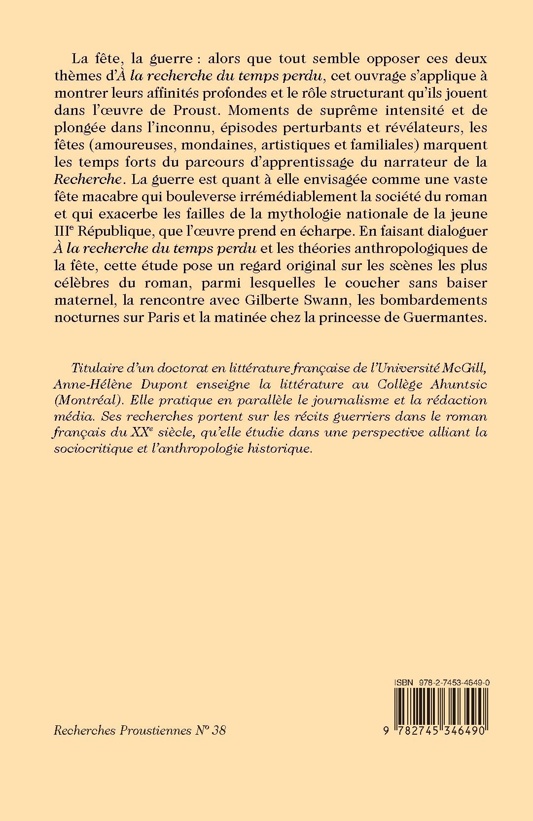 La fête, la guerre : alors que tout semble opposer ces deux thèmes d’À la recherche du temps perdu, cet ouvrage s’applique à montrer leurs affinités profondes et le rôle structurant qu’ils jouent dans l’oeuvre de Proust. Moments de suprême intensité et de plongée dans l’inconnu, épisodes perturbants et révélateurs, les fêtes (amoureuses, mondaines, artistiques et familiales) marquent les temps forts du parcours d’apprentissage du narrateur de la Recherche. La guerre est quant à elle envisagée comme une vaste fête macabre qui bouleverse irrémédiablement la société du roman et qui exacerbe les failles de la mythologie nationale de la jeune IIIe République, que l’oeuvre prend en écharpe. En faisant dialoguer À la recherche du temps perdu et les théories anthropologiques de la fête, cette étude pose un regard original sur les scènes les plus célèbres du roman, parmi lesquelles le coucher sans baiser maternel, la rencontre avec Gilberte Swann, les bombardements nocturnes sur Paris et la matinée chez la princesse de Guermantes.
