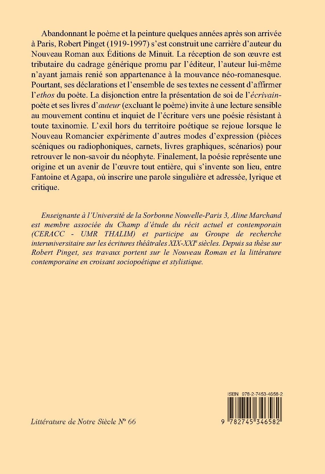 Abandonnant le poème et la peinture quelques années après son arrivée à Paris, Robert Pinget (1919-1997) s’est construit une carrière d’auteur du Nouveau Roman aux Éditions de Minuit. La réception de son oeuvre est tributaire du cadrage générique promu par l’éditeur, l’auteur lui-même n’ayant jamais renié son appartenance à la mouvance néo-romanesque. Pourtant, ses déclarations et l’ensemble de ses textes ne cessent d’affirmer l’ethos du poète. La disjonction entre la présentation de soi de l’écrivain-poète et ses livres d’auteur (excluant le poème) invite à une lecture sensible au mouvement continu et inquiet de l’écriture vers une poésie résistant à toute taxinomie. L’exil hors du territoire poétique se rejoue lorsque le Nouveau Romancier expérimente d’autres modes d’expression (pièces scéniques ou radiophoniques, carnets, livres graphiques, scénarios) pour retrouver le non-savoir du néophyte. Finalement, la poésie représente une origine et un avenir de l’oeuvre tout entière, qui s’invente son lieu, entre Fantoine et Agapa, où inscrire une parole singulière et adressée, lyrique et critique.