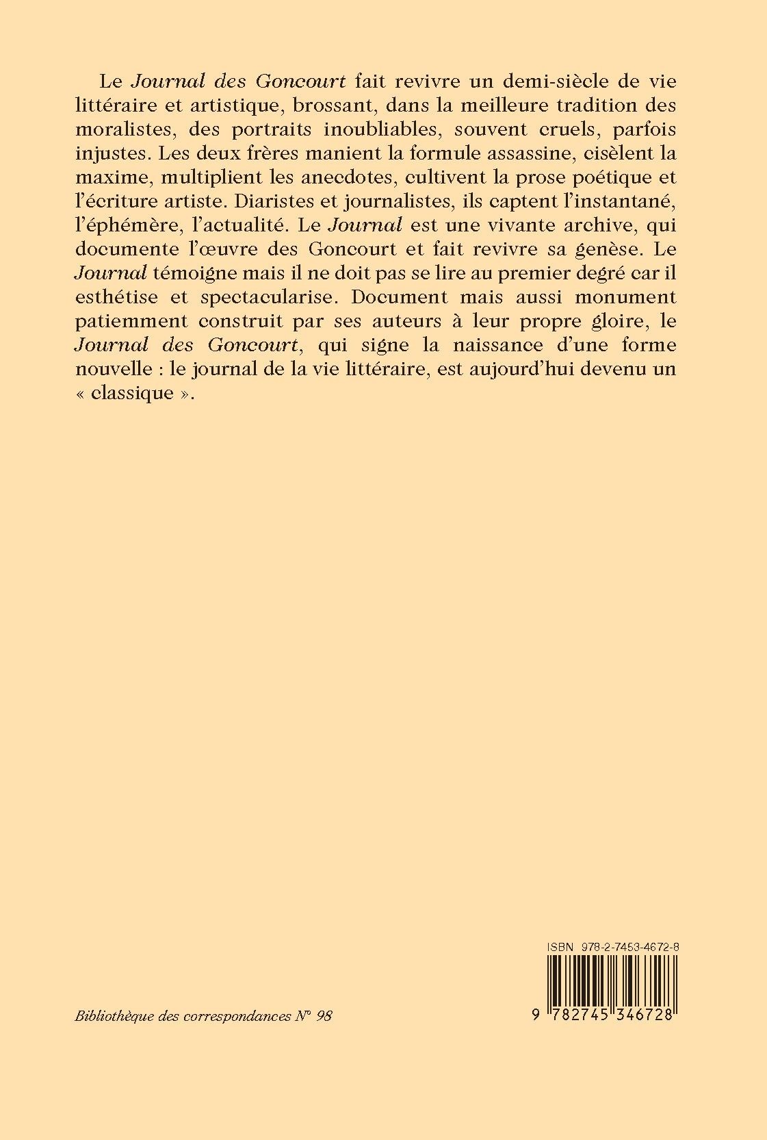 Le Journal des Goncourt fait revivre un demi-siècle de vie littéraire et artistique, brossant, dans la meilleure tradition des moralistes, des portraits inoubliables, souvent cruels, parfois injustes. Les deux frères manient la formule assassine, cisèlent la maxime, multiplient les anecdotes, cultivent la prose poétique et l’écriture artiste. Diaristes et journalistes, ils captent l’instantané, l’éphémère, l’actualité. Le Journal est une vivante archive, qui documente l’oeuvre des Goncourt et fait revivre sa genèse. Le Journal témoigne mais il ne doit pas se lire au premier degré car il esthétise et spectacularise. Document mais aussi monument patiemment construit par ses auteurs à leur propre gloire, le Journal des Goncourt, qui signe la naissance d’une forme nouvelle : le journal de la vie littéraire, est aujourd’hui devenu un « classique ».