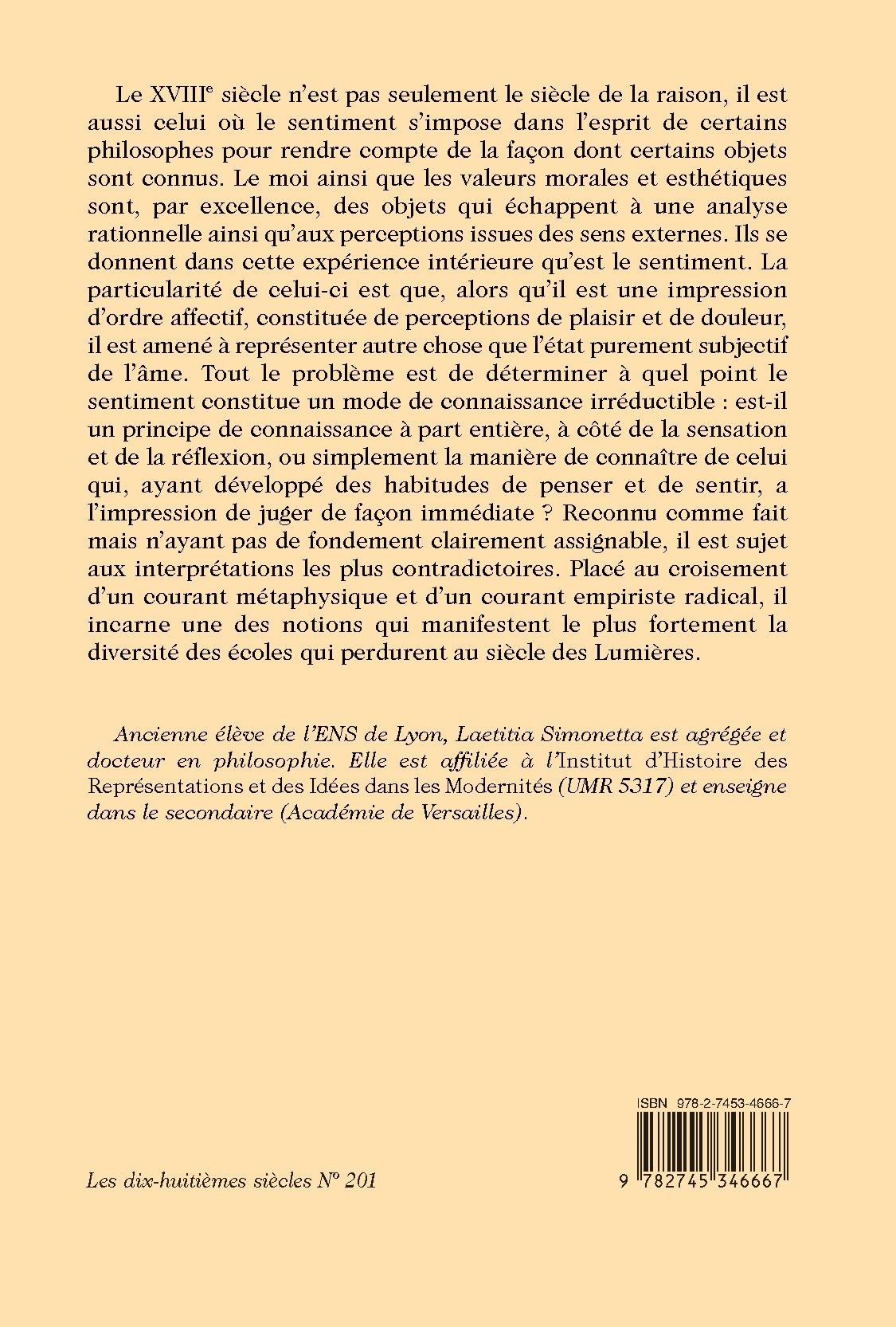 Le XVIIIe siècle n’est pas seulement le siècle de la raison, il est aussi celui où le sentiment s’impose dans l’esprit de certains philosophes pour rendre compte de la façon dont certains objets sont connus. Le moi ainsi que les valeurs morales et esthétiques sont, par excellence, des objets qui échappent à une analyse rationnelle ainsi qu’aux perceptions issues des sens externes. Ils se donnent dans cette expérience intérieure qu’est le sentiment. La particularité de celui-ci est que, alors qu’il est une impression d’ordre affectif, constituée de perceptions de plaisir et de douleur, il est amené à représenter autre chose que l’état purement subjectif de l’âme. Tout le problème est de déterminer à quel point le sentiment constitue un mode de connaissance irréductible : est-il un principe de connaissance à part entière, à côté de la sensation et de la réflexion, ou simplement la manière de connaître de celui qui, ayant développé des habitudes de penser et de sentir, a l’impression de juger de façon immédiate ? Reconnu comme fait mais n’ayant pas de fondement clairement assignable, il est sujet aux interprétations les plus contradictoires. Placé au croisement d’un courant métaphysique et d’un courant empiriste radical, il incarne une des notions qui manifestent le plus fortement la diversité des écoles qui perdurent au siècle des Lumières.