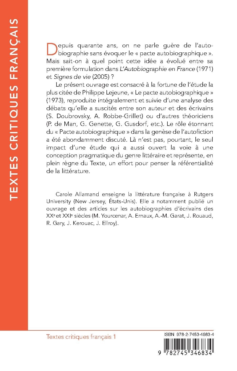 Depuis quarante ans, on ne parle guère de l’autobiographie sans évoquer le « pacte autobiographique ». Mais sait-on à quel point cette idée a évolué entre sa première formulation dans L’Autobiographie en France (1971) et Signes de vie (2005) ? Le présent ouvrage est consacré à la fortune de l’étude la plus citée de Philippe Lejeune, « Le pacte autobiographique » (1973), reproduite intégralement et suivie d’une analyse des débats qu’elle a suscités entre son auteur et des écrivains (S. Doubrovsky, A. Robbe-Grillet) ou d’autres théoriciens (P. de Man, G. Genette, G. Gusdorf, etc.). Le rôle étonnant du « Pacte autobiographique » dans la genèse de l’autofiction a été abondamment discuté. Là n’est pas, pourtant, le seul impact d’une étude qui a aussi ouvert la voie à une conception pragmatique du genre littéraire et représente, en plein règne du Texte, un effort pour penser la référentialité de la littérature.
