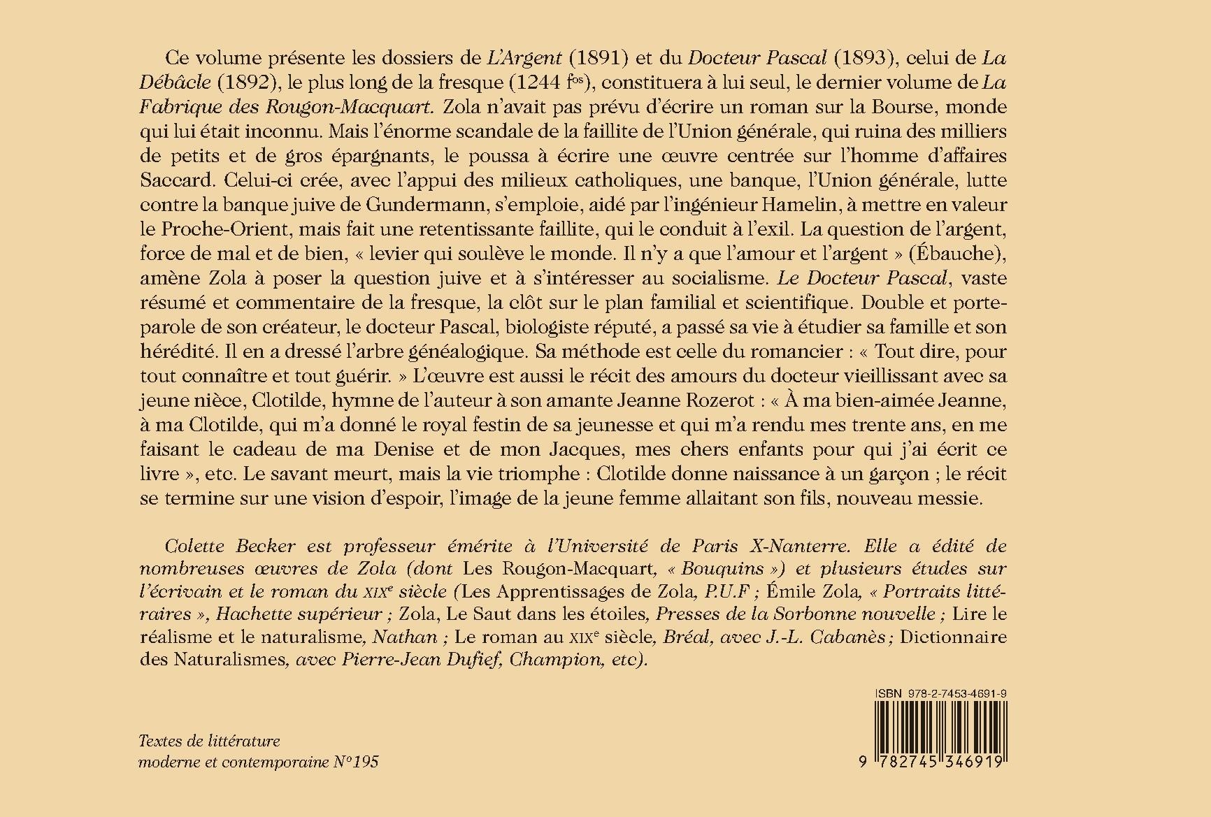 Ce volume présente les dossiers de L’Argent (1891) et du Docteur Pascal (1893), celui de La Débâcle (1892), le plus long de la fresque (1244 fos), constituera à lui seul, le dernier volume de La Fabrique des Rougon-Macquart. Zola n’avait pas prévu d’écrire un roman sur la Bourse, monde qui lui était inconnu. Mais l’énorme scandale de la faillite de l’Union générale, qui ruina des milliers de petits et de gros épargnants, le poussa à écrire une œuvre centrée sur l’homme d’affaires Saccard. Celui-ci crée, avec l’appui des milieux catholiques, une banque, l’Union générale, lutte contre la banque juive de Gundermann, s’emploie, aidé par l’ingénieur Hamelin, à mettre en valeur le Proche-Orient, mais fait une retentissante faillite, qui le conduit à l’exil. La question de l’argent, force de mal et de bien, « levier qui soulève le monde. Il n’y a que l’amour et l’argent » (Ébauche), amène Zola à poser la question juive et à s’intéresser au socialisme. Le Docteur Pascal, vaste résumé et commentaire de la fresque, la clôt sur le plan familial et scientifique. Double et porte-parole de son créateur, le docteur Pascal, biologiste réputé, a passé sa vie à étudier sa famille et son hérédité. Il en a dressé l’arbre généalogique. Sa méthode est celle du romancier : « Tout dire, pour tout connaître et tout guérir. » L’œuvre est aussi le récit des amours du docteur vieillissant avec sa jeune nièce, Clotilde, hymne de l’auteur à son amante Jeanne Rozerot : « À ma bien-aimée Jeanne, à ma Clotilde, qui m’a donné le royal festin de sa jeunesse et qui m’a rendu mes trente ans, en me faisant le cadeau de ma Denise et de mon Jacques, mes chers enfants pour qui j’ai écrit ce livre », etc. Le savant meurt, mais la vie triomphe : Clotilde donne naissance à un garçon ; le récit se termine sur une vision d’espoir, l’image de la jeune femme allaitant son fils, nouveau messie.
