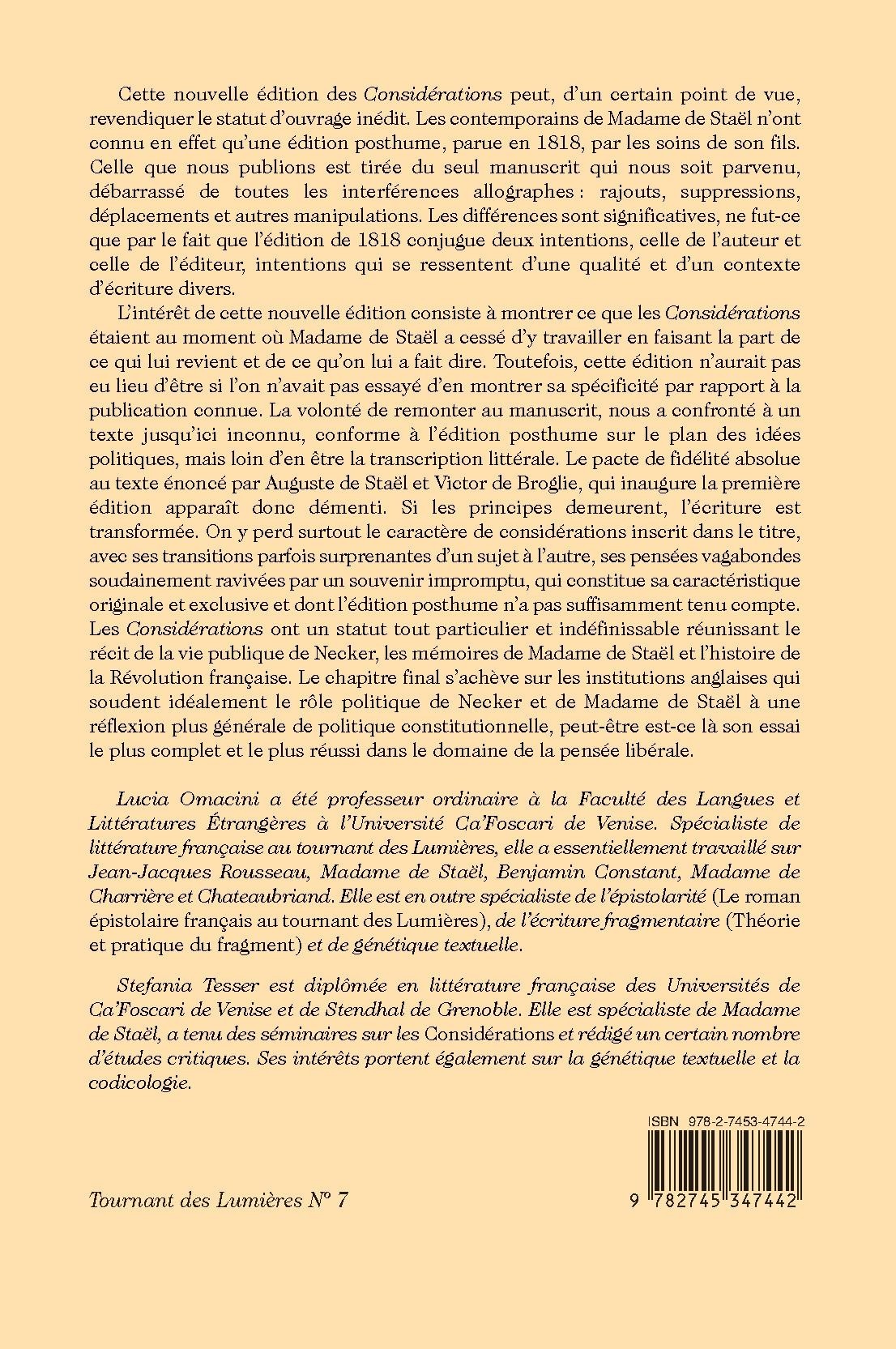 Cette nouvelle édition des Considérations peut, d’un certain point de vue, revendiquer le statut d’ouvrage inédit. Les contemporains de Madame de Staël n’ont connu en effet qu’une édition posthume, parue en 1818, par les soins de son fils. Celle que nous publions est tirée du seul manuscrit qui nous soit parvenu, débarrassé de toutes les interférences allographes : rajouts, suppressions, déplacements et autres manipulations. Les différences sont significatives, ne fut-ce que par le fait que l’édition de 1818 conjugue deux intentions, celle de l’auteur et celle de l’éditeur, intentions qui se ressentent d’une qualité et d’un contexte d’écriture divers.