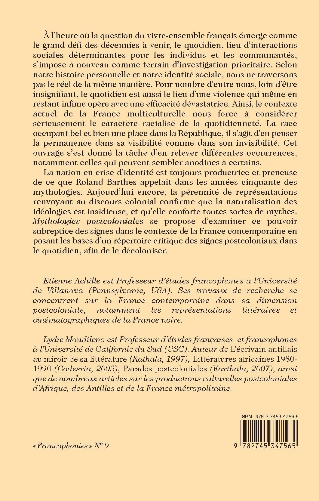 La nation en crise d’identité est toujours productrice et preneuse de ce que Roland Barthes appelait dans les années cinquante des mythologies. Aujourd’hui encore, la pérennité de représentations renvoyant au discours colonial confirme que la naturalisation des idéologies est insidieuse, et qu’elle conforte toutes sortes de mythes. Mythologies postcoloniales se propose d’examiner ce pouvoir subreptice des signes dans le contexte de la France contemporaine en posant les bases d’un répertoire critique des signes postcoloniaux dans le quotidien, afin de le décoloniser.