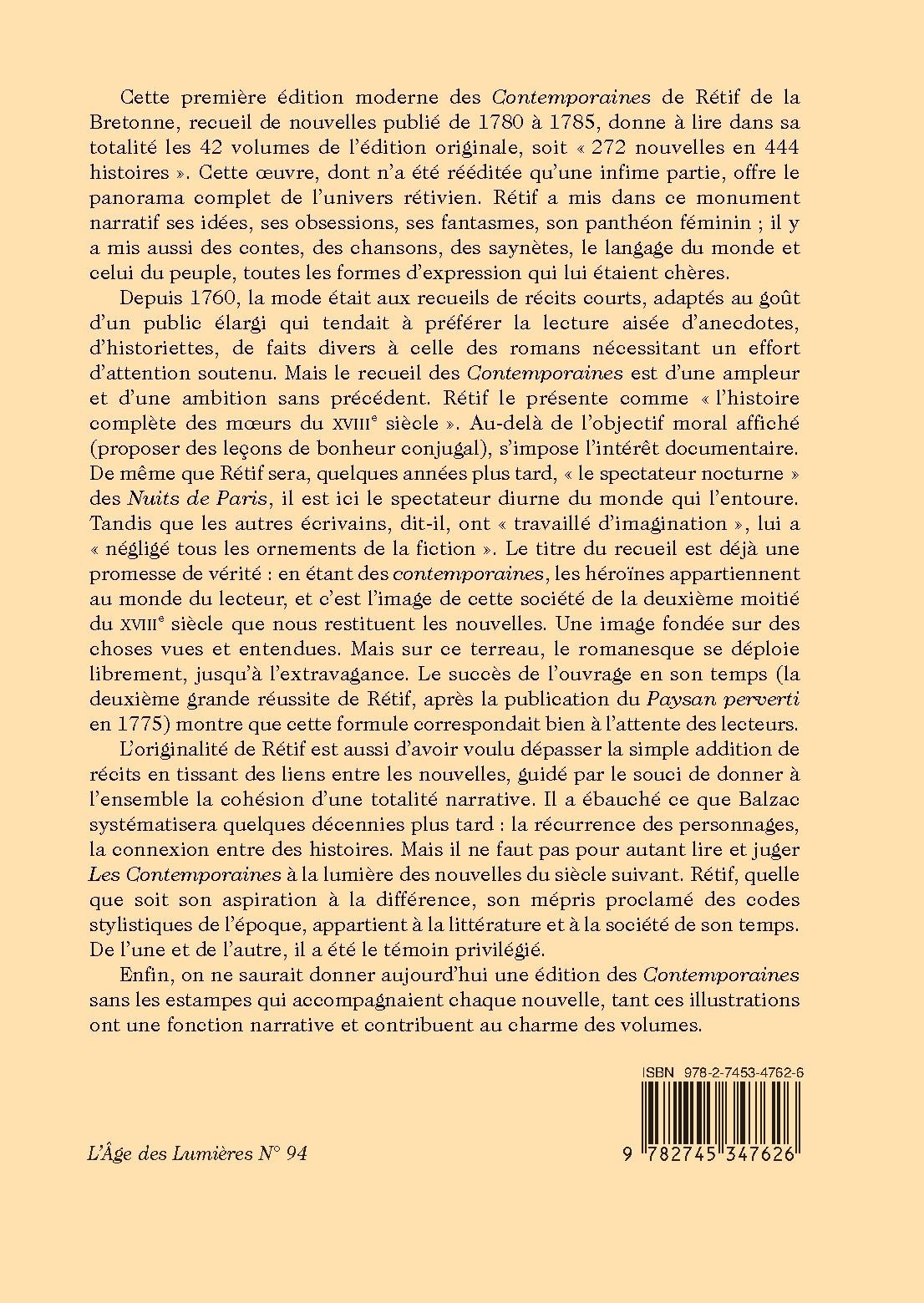 Cette première édition moderne des Contemporaines de Rétif de la Bretonne, recueil de nouvelles publié de 1780 à 1785, donne à lire dans sa totalité les 42 volumes de l’édition originale, soit « 272 nouvelles en 444 histoires ». Cette oeuvre, dont n’a été rééditée qu’une infime partie, offre le panorama complet de l’univers rétivien. Rétif a mis dans ce monument narratif ses idées, ses obsessions, ses fantasmes, son panthéon féminin ; il y a mis aussi des contes, des chansons, des saynètes, le langage du monde et celui du peuple, toutes les formes d’expression qui lui étaient chères.