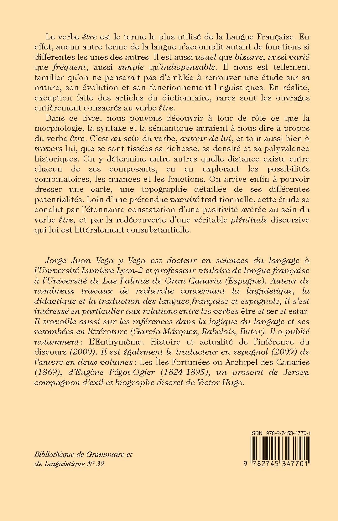 Dans ce livre, nous pouvons découvrir à tour de rôle ce que la morphologie, la syntaxe et la sémantique auraient à nous dire à propos du verbe être. C’est au sein du verbe, autour de lui, et tout aussi bien à travers lui, que se sont tissées sa richesse, sa densité et sa polyvalence historiques. On y détermine entre autres quelle distance existe entre chacun de ses composants, en en explorant les possibilités combinatoires, les nuances et les fonctions. On arrive enfin à pouvoir dresser une carte, une topographie détaillée de ses différentes potentialités. Loin d’une prétendue vacuité traditionnelle, cette étude se conclut par l’étonnante constatation d’une positivité avérée au sein du verbe être, et par la redécouverte d’une véritable plénitude discursive qui lui est littéralement consubstantielle.