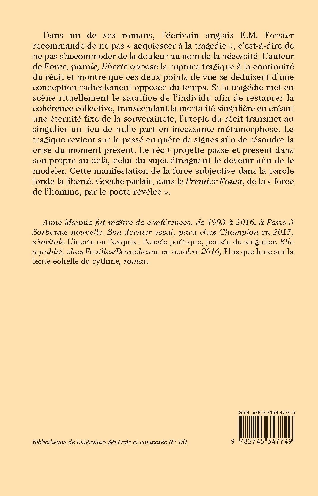 Dans un de ses romans, l’écrivain anglais E.M. Forster recommande de ne pas « acquiescer à la tragédie », c’est-à-dire de ne pas s’accommoder de la douleur au nom de la nécessité. L’auteur de Force, parole, liberté oppose la rupture tragique à la continuité du récit et montre que ces deux points de vue se déduisent d’une conception radicalement opposée du temps. Si la tragédie met en scène rituellement le sacrifice de l’individu afin de restaurer la cohérence collective, transcendant la mortalité singulière en créant une éternité fixe de la souveraineté, l’utopie du récit transmet au singulier un lieu de nulle part en incessante métamorphose. Le tragique revient sur le passé en quête de signes afin de résoudre la crise du moment présent. Le récit projette passé et présent dans son propre au-delà, celui du sujet étreignant le devenir afin de le modeler. Cette manifestation de la force subjective dans la parole fonde la liberté. Goethe parlait, dans le Premier Faust, de la « force de l’homme, par le poète révélée ».