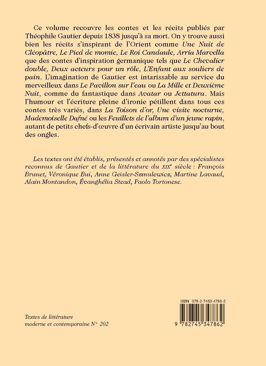 Ce volume recouvre les contes et les récits publiés par Théophile Gautier depuis 1838 jusqu’à sa mort. On y trouve aussi bien les récits s’inspirant de l’Orient comme Une Nuit de Cléopâtre, Le Pied de momie, Le Roi Candaule, Arria Marcella que des contes d’inspiration germanique tels que Le Chevalier double, Deux acteurs pour un rôle, L’Enfant aux souliers de pain. L’imagination de Gautier est intarissable au service du merveilleux dans Le Pavillon sur l’eau ou La Mille et Deuxième Nuit, comme du fantastique dans Avatar ou Jettatura. Mais l’humour et l’écriture pleine d’ironie pétillent dans tous ces contes très variés, dans La Toison d’or, Une visite nocturne, Mademoiselle Dafné ou les Feuillets de l’album d’un jeune rapin, autant de petits chefs-d'œuvre d’un écrivain artiste jusqu’au bout des ongles.