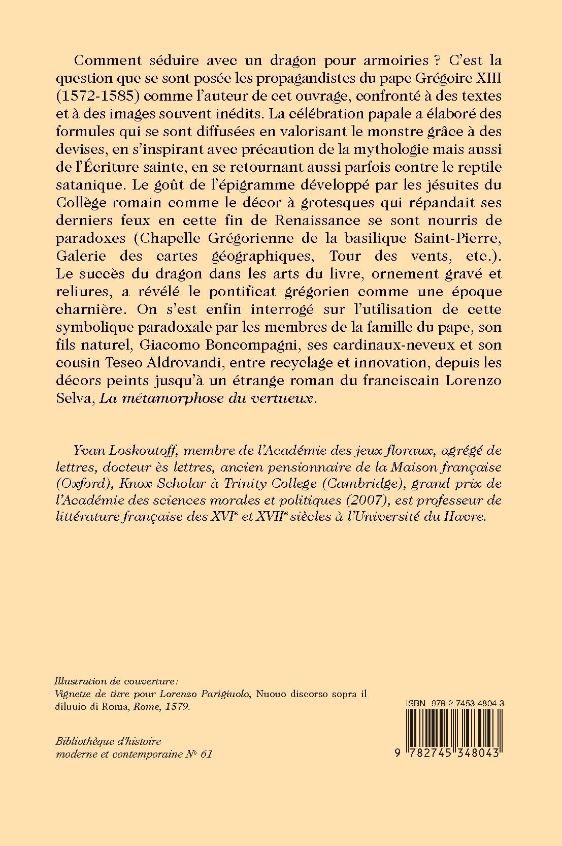 Comment séduire avec un dragon pour armoiries ? C’est la question que se sont posée les propagandistes du pape Grégoire XIII (1572-1585) comme l’auteur de cet ouvrage, confronté à des textes et à des images souvent inédits. La célébration papale a élaboré des formules qui se sont diffusées en valorisant le monstre grâce à des devises, en s’inspirant avec précaution de la mythologie mais aussi de l’Écriture sainte, en se retournant aussi parfois contre le reptile satanique. Le goût de l’épigramme développé par les jésuites du Collège romain comme le décor à grotesques qui répandait ses derniers feux en cette fin de Renaissance se sont nourris de paradoxes (Chapelle Grégorienne de la basilique Saint-Pierre, Galerie des cartes géographiques, Tour des vents, etc.). Le succès du dragon dans les arts du livre, ornement gravé et reliures, a révélé le pontificat grégorien comme une époque charnière. On s’est enfin interrogé sur l’utilisation de cette symbolique paradoxale par les membres de la famille du pape, son fils naturel, Giacomo Boncompagni, ses cardinaux-neveux et son cousin Teseo Aldrovandi, entre recyclage et innovation, depuis les décors peints jusqu’à un étrange roman du franciscain Lorenzo Selva, La métamorphose du vertueux.