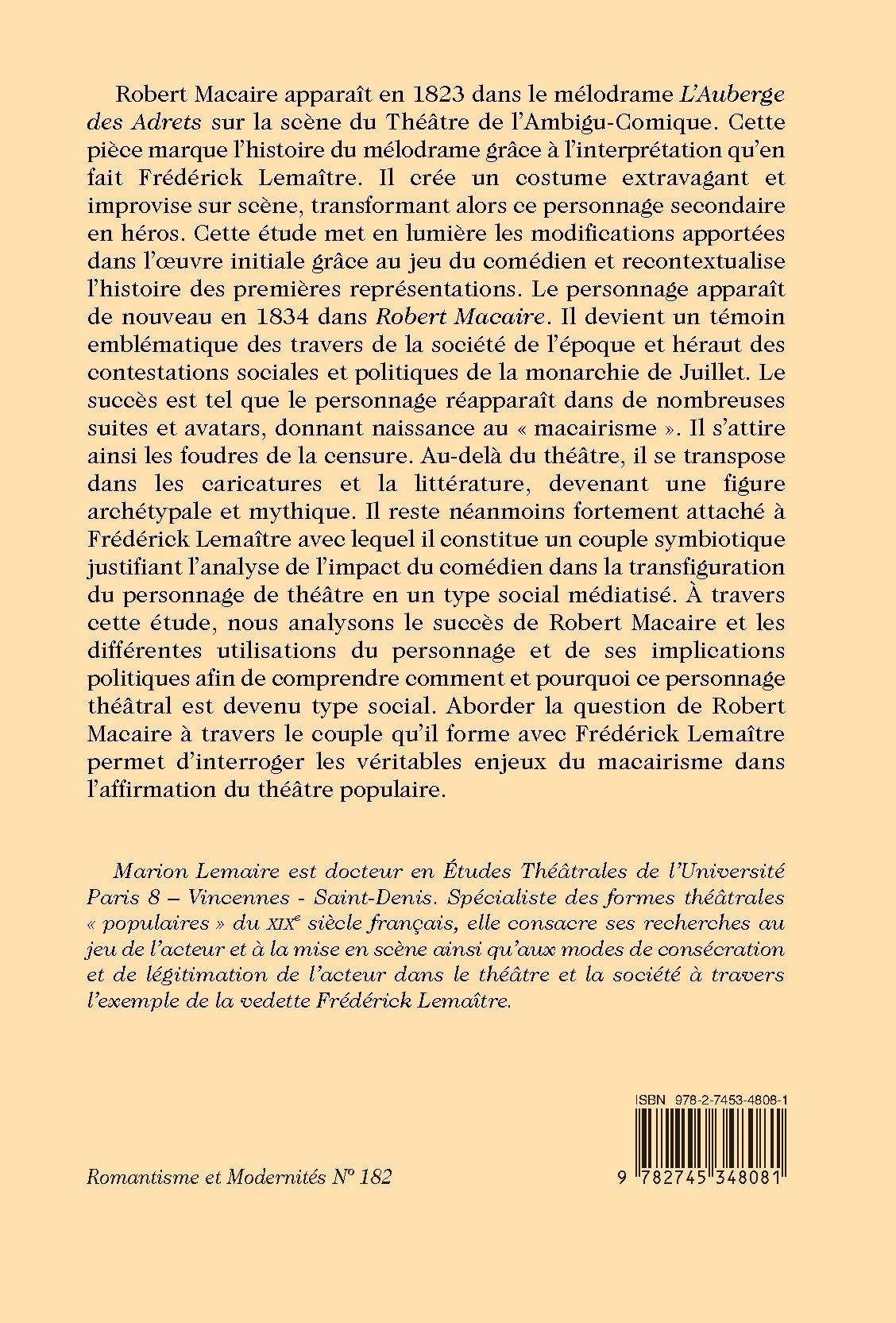Robert Macaire apparaît en 1823 dans le mélodrame L’Auberge des Adrets sur la scène du Théâtre de l’Ambigu-Comique. Cette pièce marque l’histoire du mélodrame grâce à l’interprétation qu’en fait Frédérick Lemaître. Il crée un costume extravagant et improvise sur scène, transformant alors ce personnage secondaire en héros. Cette étude met en lumière les modifications apportées dans l’oeuvre initiale grâce au jeu du comédien et recontextualise l’histoire des premières représentations. Le personnage apparaît de nouveau en 1834 dans Robert Macaire. Il devient un témoin emblématique des travers de la société de l’époque et héraut des contestations sociales et politiques de la monarchie de Juillet. Le succès est tel que le personnage réapparaît dans de nombreuses suites et avatars, donnant naissance au « macairisme ». Il s’attire ainsi les foudres de la censure. Au-delà du théâtre, il se transpose dans les caricatures et la littérature, devenant une figure archétypale et mythique. Il reste néanmoins fortement attaché à Frédérick Lemaître avec lequel il constitue un couple symbiotique justifiant l’analyse de l’impact du comédien dans la transfiguration du personnage de théâtre en un type social médiatisé. À travers cette étude, nous analysons le succès de Robert Macaire et les différentes utilisations du personnage et de ses implications politiques afin de comprendre comment et pourquoi ce personnage théâtral est devenu type social. Aborder la question de Robert Macaire à travers le couple qu’il forme avec Frédérick Lemaître permet d’interroger les véritables enjeux du macairisme dans l’affirmation du théâtre populaire.