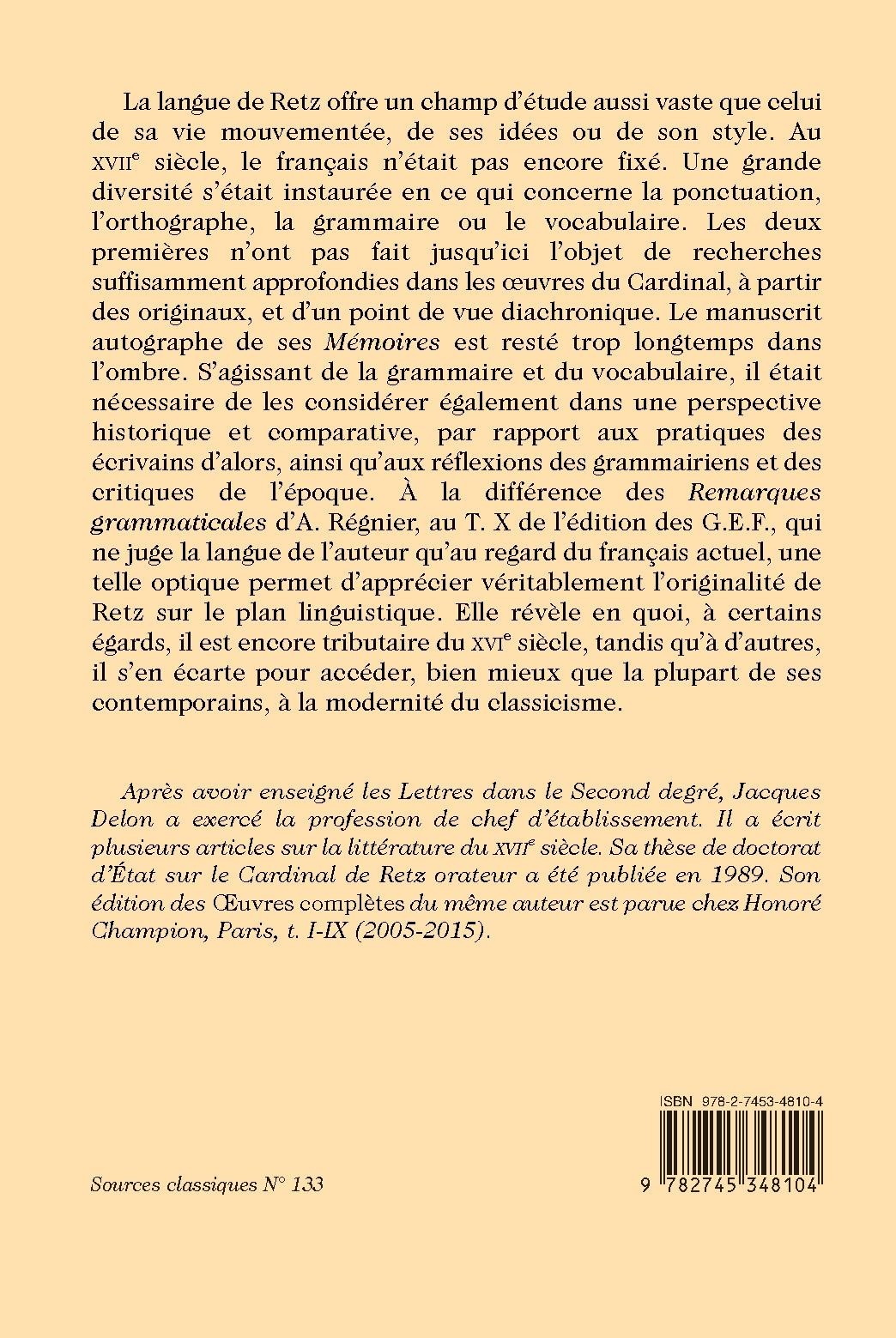 La langue de Retz offre un champ d’étude aussi vaste que celui de sa vie mouvementée, de ses idées ou de son style. Au XVIIe siècle, le français n’était pas encore fixé. Une grande diversité s’était instaurée en ce qui concerne la ponctuation, l’orthographe, la grammaire ou le vocabulaire. Les deux premières n’ont pas fait jusqu’ici l’objet de recherches suffisamment approfondies dans les œuvres du Cardinal, à partir des originaux, et d’un point de vue diachronique. Le manuscrit autographe de ses Mémoires est resté trop longtemps dans l’ombre. S’agissant de la grammaire et du vocabulaire, il était nécessaire de les considérer également dans une perspective historique et comparative, par rapport aux pratiques des écrivains d’alors, ainsi qu’aux réflexions des grammairiens et des critiques de l’époque. À la différence des Remarques grammaticales d’A. Régnier, au T. X de l’édition des G.E.F., qui ne juge la langue de l’auteur qu’au regard du français actuel, une telle optique permet d’apprécier véritablement l’originalité de Retz sur le plan linguistique. Elle révèle en quoi, à certains égards, il est encore tributaire du XVIe siècle, tandis qu’à d’autres, il s’en écarte pour accéder, bien mieux que la plupart de ses contemporains, à la modernité du classicisme.