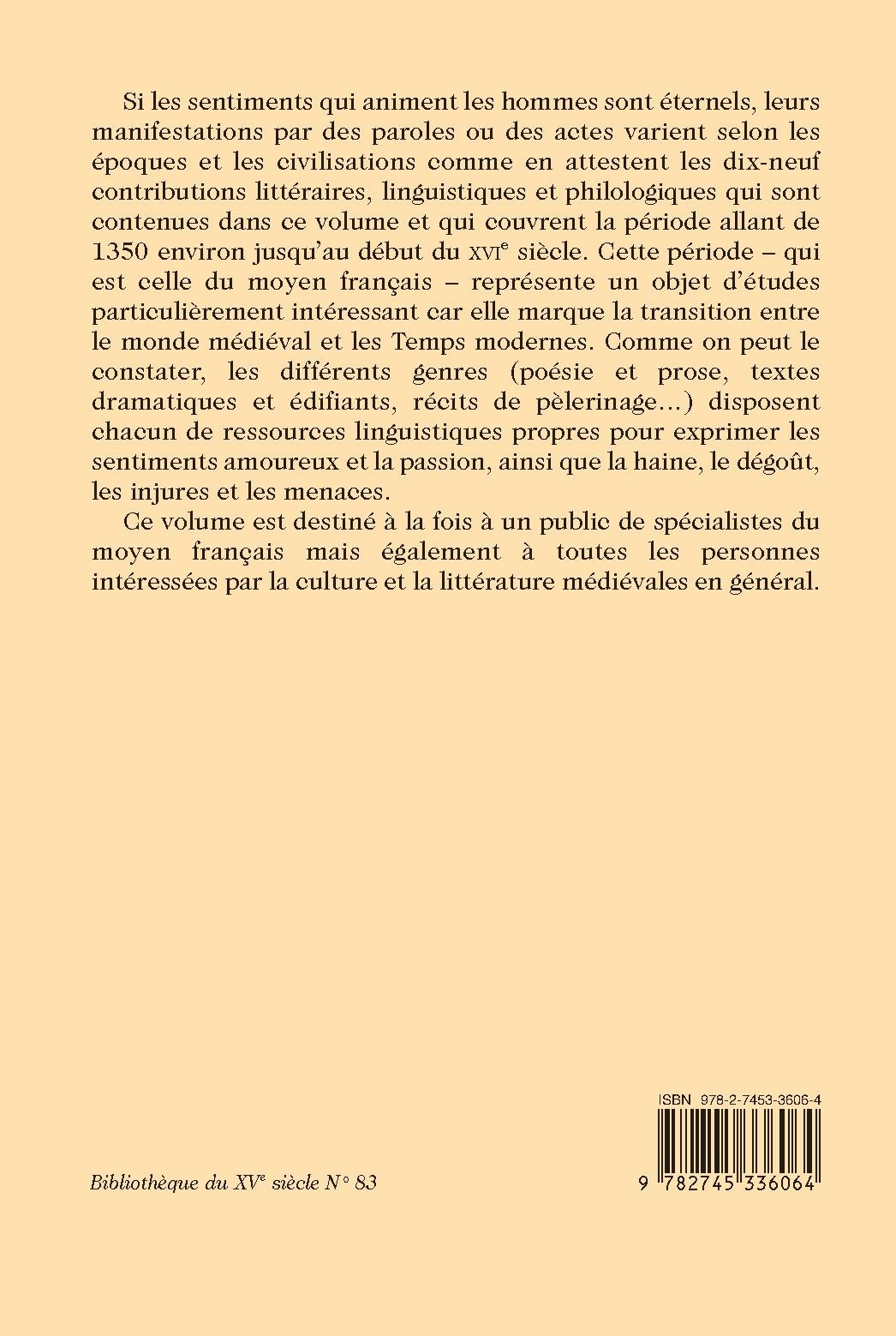 Si les sentiments qui animent les hommes sont éternels, leurs manifestations par des paroles ou des actes varient selon les époques et les civilisations comme en attestent les dix-neuf contributions littéraires, linguistiques et philologiques qui sont contenues dans ce volume et qui couvrent la période allant de 1350 environ jusqu’au début du XVIe siècle. Cette période – qui est celle du moyen français – représente un objet d’études particulièrement intéressant car elle marque la transition entre le monde médiéval et les Temps modernes. Comme on peut le constater, les différents genres (poésie et prose, textes dramatiques et édifiants, récits de pèlerinage…) disposent chacun de ressources linguistiques propres pour exprimer les sentiments amoureux et la passion, ainsi que la haine, le dégoût, les injures et les menaces.