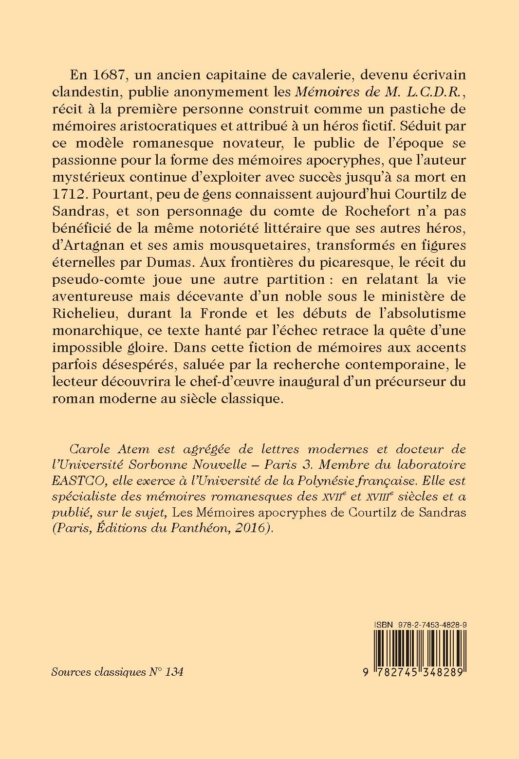 En 1687, un ancien capitaine de cavalerie, devenu écrivain clandestin, publie anonymement les Mémoires de M. L.C.D.R., récit à la première personne construit comme un pastiche de mémoires aristocratiques et attribué à un héros fictif. Séduit par ce modèle romanesque novateur, le public de l’époque se passionne pour la forme des mémoires apocryphes, que l’auteur mystérieux continue d’exploiter avec succès jusqu’à sa mort en 1712. Pourtant, peu de gens connaissent aujourd’hui Courtilz de Sandras, et son personnage du comte de Rochefort n’a pas bénéficié de la même notoriété littéraire que ses autres héros, d’Artagnan et ses amis mousquetaires, transformés en figures éternelles par Dumas. Aux frontières du picaresque, le récit du pseudo-comte joue une autre partition : en relatant la vie aventureuse mais décevante d’un noble sous le ministère de Richelieu, durant la Fronde et les débuts de l’absolutisme monarchique, ce texte hanté par l’échec retrace la quête d’une impossible gloire. Dans cette fiction de mémoires aux accents parfois désespérés, saluée par la recherche contemporaine, le lecteur découvrira le chef-d'œuvre inaugural d’un précurseur du roman moderne au siècle classique.