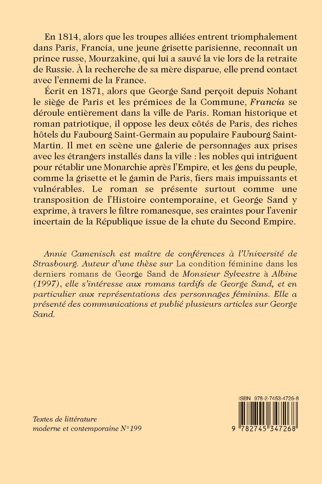 Écrit en 1871, alors que George Sand perçoit depuis Nohant le siège de Paris et les prémices de la Commune, Francia se déroule entièrement dans la ville de Paris. Roman historique et roman patriotique, il oppose les deux côtés de Paris, des riches hôtels du Faubourg Saint-Germain au populaire Faubourg Saint- Martin. Il met en scène une galerie de personnages aux prises avec les étrangers installés dans la ville : les nobles qui intriguent pour rétablir une Monarchie après l’Empire, et les gens du peuple, comme la grisette et le gamin de Paris, fiers mais impuissants et vulnérables. Le roman se présente surtout comme une transposition de l’Histoire contemporaine, et George Sand y exprime, à travers le filtre romanesque, ses craintes pour l’avenir incertain de la République issue de la chute du Second Empire.