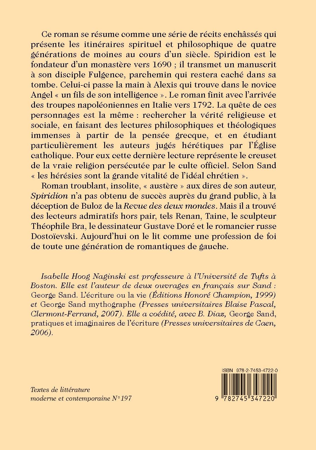 Ce roman se résume comme une série de récits enchâssés qui présente les itinéraires spirituel et philosophique de quatre générations de moines au cours d’un siècle. Spiridion est le fondateur d’un monastère vers 1690 ; il transmet un manuscrit à son disciple Fulgence, parchemin qui restera caché dans sa tombe. Celui-ci passe la main à Alexis qui trouve dans le novice Angel « un fils de son intelligence ». Le roman finit avec l’arrivée des troupes napoléoniennes en Italie vers 1792. La quête de ces personnages est la même : rechercher la vérité religieuse et sociale, en faisant des lectures philosophiques et théologiques immenses à partir de la pensée grecque, et en étudiant particulièrement les auteurs jugés hérétiques par l’Église catholique. Pour eux cette dernière lecture représente le creuset de la vraie religion persécutée par le culte officiel. Selon Sand « les hérésies sont la grande vitalité de l’idéal chrétien ».