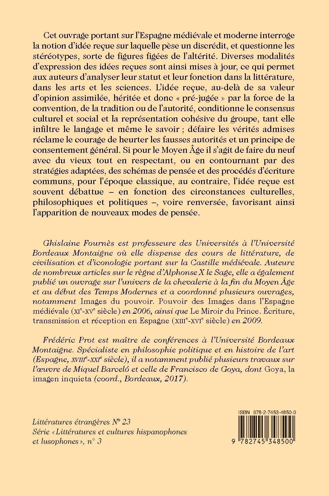 Cet ouvrage portant sur l’Espagne médiévale et moderne interroge la notion d’idée reçue sur laquelle pèse un discrédit, et questionne les stéréotypes, sorte de figures figées de l’altérité. Diverses modalités d’expression des idées reçues sont ainsi mises à jour, ce qui permet aux auteurs d’analyser leur statut et leur fonction dans la littérature, dans les arts et les sciences. L’idée reçue, au-delà de sa valeur d’opinion assimilée, héritée et donc « pré-jugée » par la force de la convention, de la tradition ou de l’autorité, conditionne le consensus culturel et social et la représentation cohésive du groupe, tant elle infiltre le langage et même le savoir ; défaire les vérités admises réclame le courage de heurter les fausses autorités et un principe de consentement général. Si pour le Moyen Âge il s’agit de faire du neuf avec du vieux tout en respectant, ou en contournant par des stratégies adaptées, des schémas de pensée et des procédés d’écriture communs, pour l’époque classique, au contraire, l’idée reçue est souvent débattue – en fonction des circonstances culturelles, philosophiques et politiques –, voire renversée, favorisant ainsi l’apparition de nouveaux modes de pensée.
