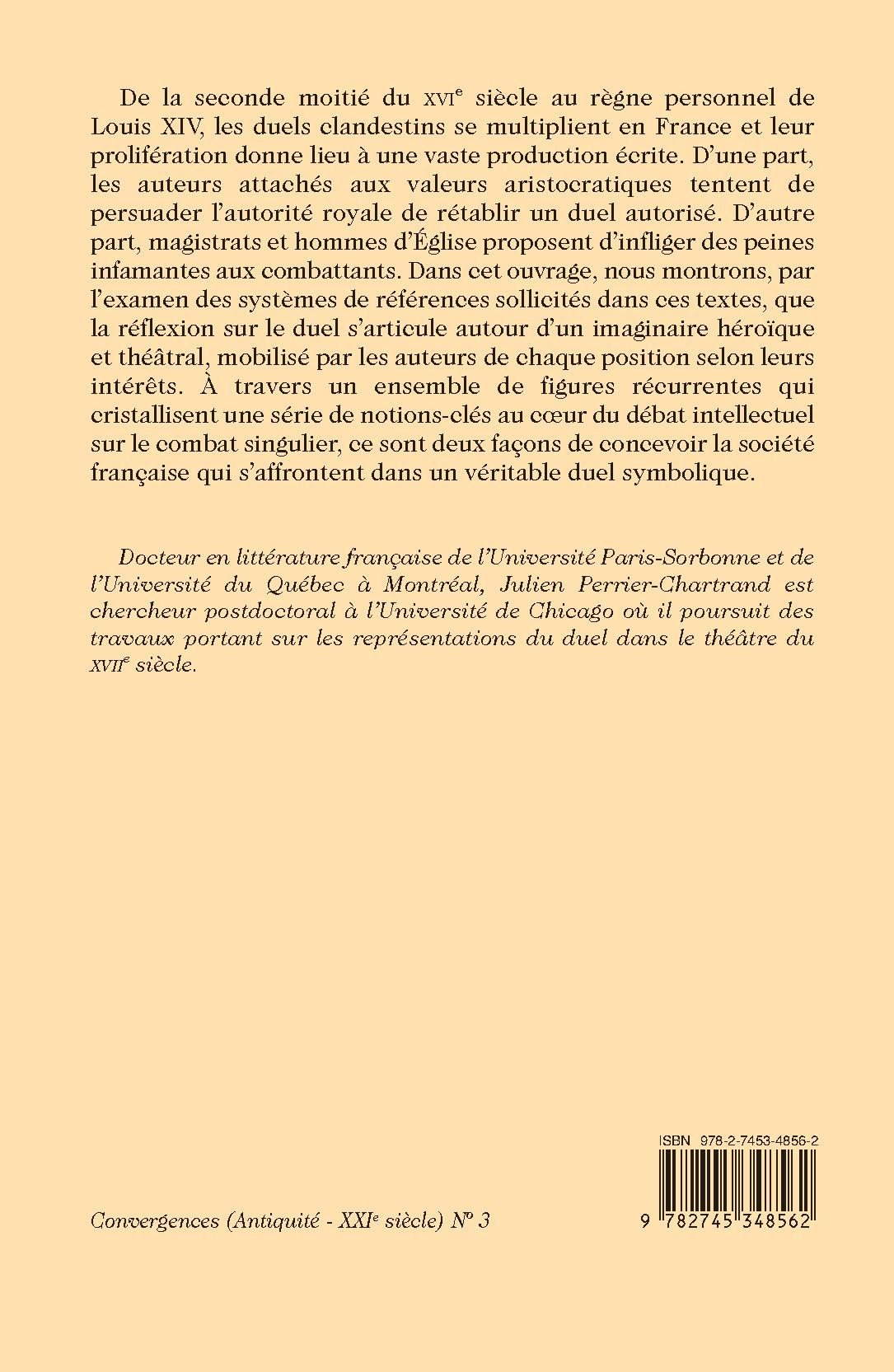 De la seconde moitié du XVIe siècle au règne personnel de Louis XIV, les duels clandestins se multiplient en France et leur prolifération donne lieu à une vaste production écrite. D’une part, les auteurs attachés aux valeurs aristocratiques tentent de persuader l’autorité royale de rétablir un duel autorisé. D’autre part, magistrats et hommes d’Église proposent d’infliger des peines infamantes aux combattants. Dans cet ouvrage, nous montrons, par l’examen des systèmes de références sollicités dans ces textes, que la réflexion sur le duel s’articule autour d’un imaginaire héroïque et théâtral, mobilisé par les auteurs de chaque position selon leurs intérêts. À travers un ensemble de figures récurrentes qui cristallisent une série de notions-clés au cœur du débat intellectuel sur le combat singulier, ce sont deux façons de concevoir la société française qui s’affrontent dans un véritable duel symbolique.