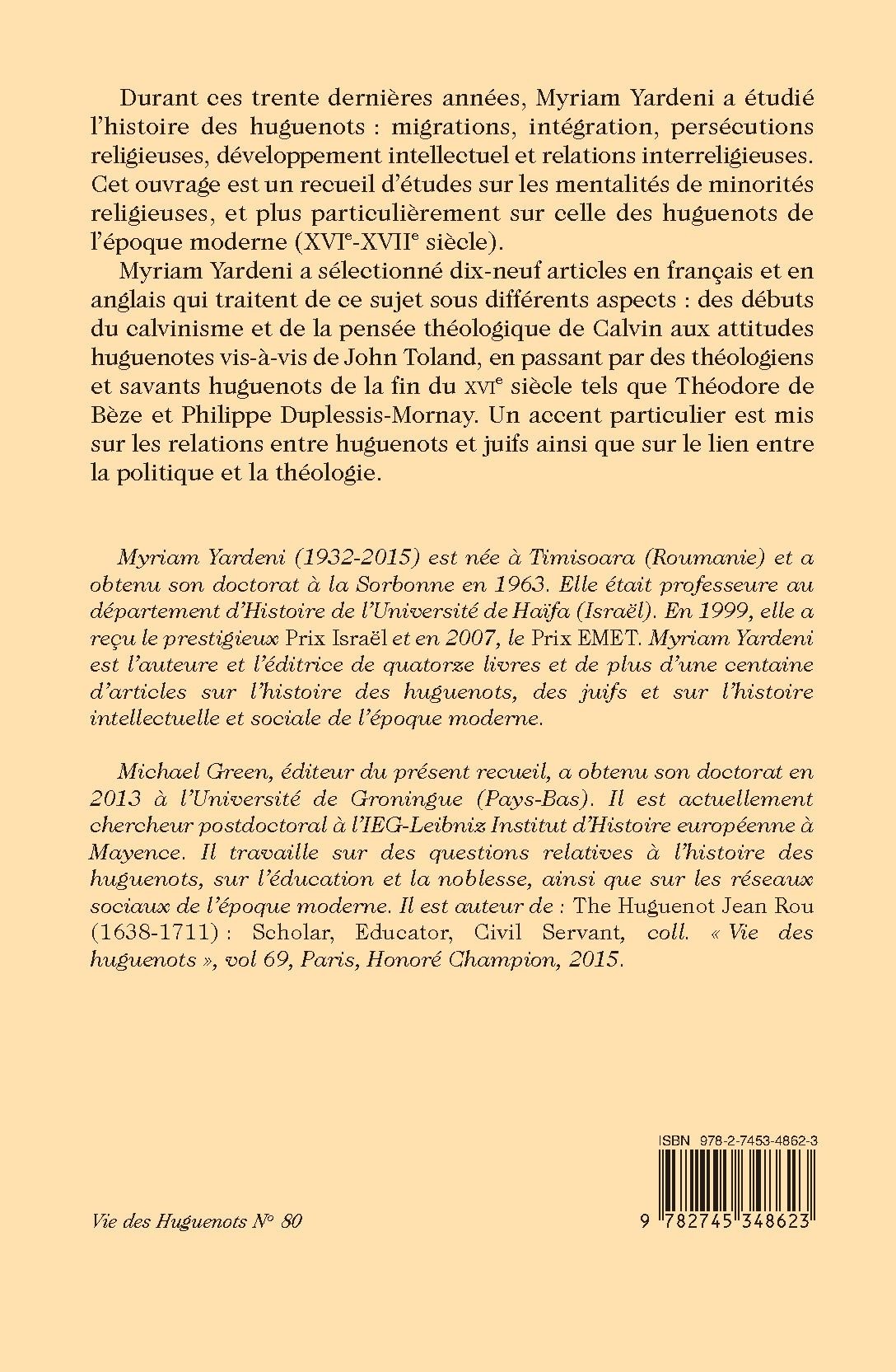 Myriam Yardeni a sélectionné dix-neuf articles en français et en anglais qui traitent de ce sujet sous différents aspects : des débuts du calvinisme et de la pensée théologique de Calvin aux attitudes huguenotes vis-à-vis de John Toland, en passant par des théologiens et savants huguenots de la fin du XVIe siècle tels que Théodore de Bèze et Philippe Duplessis-Mornay. Un accent particulier est mis sur les relations entre huguenots et juifs ainsi que sur le lien entre la politique et la théologie.