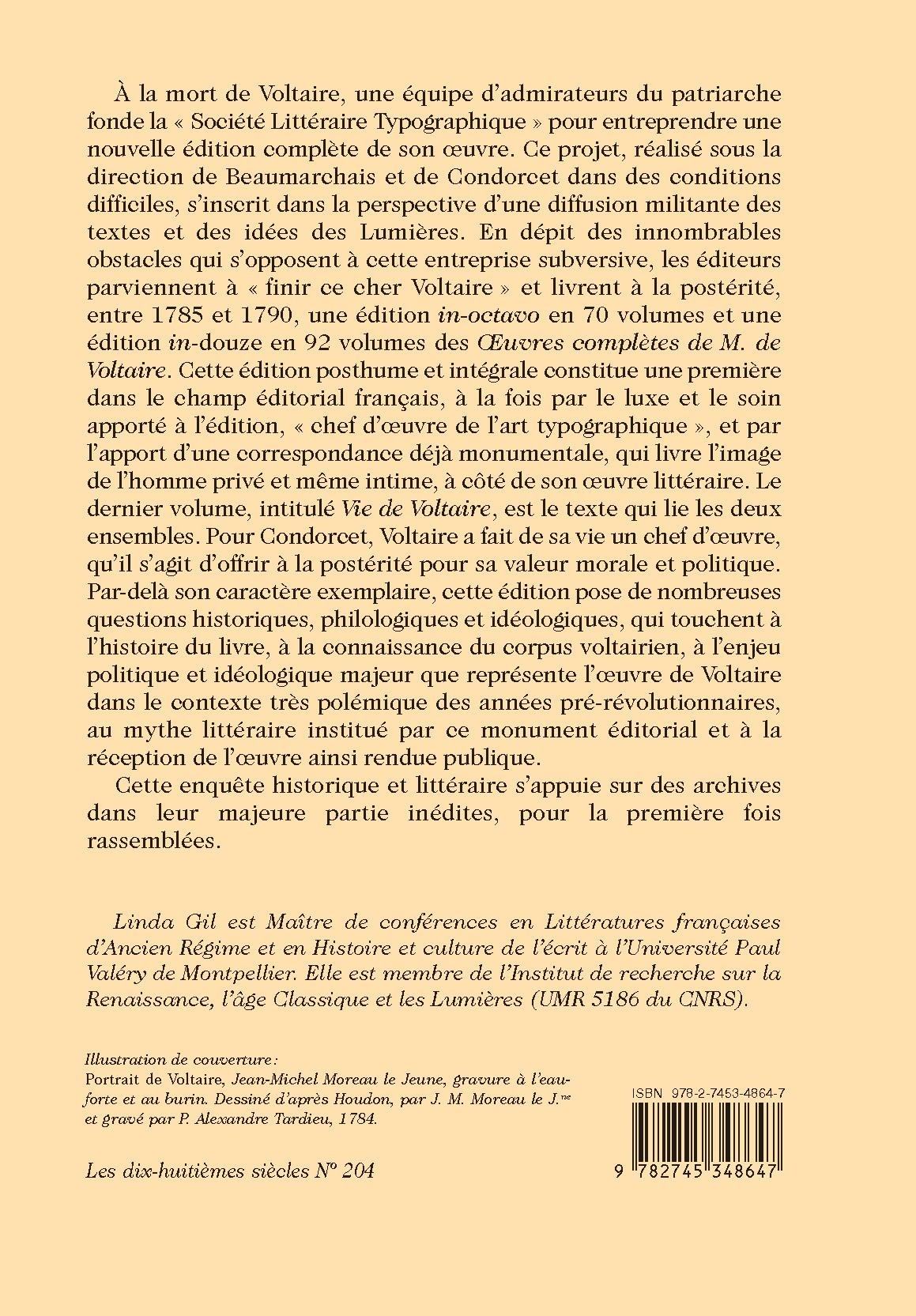 À la mort de Voltaire, une équipe d’admirateurs du patriarche fonde la « Société Littéraire Typographique » pour entreprendre une nouvelle édition complète de son oeuvre. Ce projet, réalisé sous la direction de Beaumarchais et de Condorcet dans des conditions difficiles, s’inscrit dans la perspective d’une diffusion militante des textes et des idées des Lumières. En dépit des innombrables obstacles qui s’opposent à cette entreprise subversive, les éditeurs parviennent à « finir ce cher Voltaire » et livrent à la postérité, entre 1785 et 1790, une édition in-octavo en 70 volumes et une édition in-douze en 92 volumes des Œuvres complètes de M. de Voltaire. Cette édition posthume et intégrale constitue une première dans le champ éditorial français, à la fois par le luxe et le soin apporté à l’édition, « chef d’oeuvre de l’art typographique », et par l’apport d’une correspondance déjà monumentale, qui livre l’image de l’homme privé et même intime, à côté de son oeuvre littéraire. Le dernier volume, intitulé Vie de Voltaire, est le texte qui lie les deux ensembles. Pour Condorcet, Voltaire a fait de sa vie un chef d’oeuvre, qu’il s’agit d’offrir à la postérité pour sa valeur morale et politique. Par-delà son caractère exemplaire, cette édition pose de nombreuses questions historiques, philologiques et idéologiques, qui touchent à l’histoire du livre, à la connaissance du corpus voltairien, à l’enjeu politique et idéologique majeur que représente l’oeuvre de Voltaire dans le contexte très polémique des années pré-révolutionnaires, au mythe littéraire institué par ce monument éditorial et à la réception de l’oeuvre ainsi rendue publique.