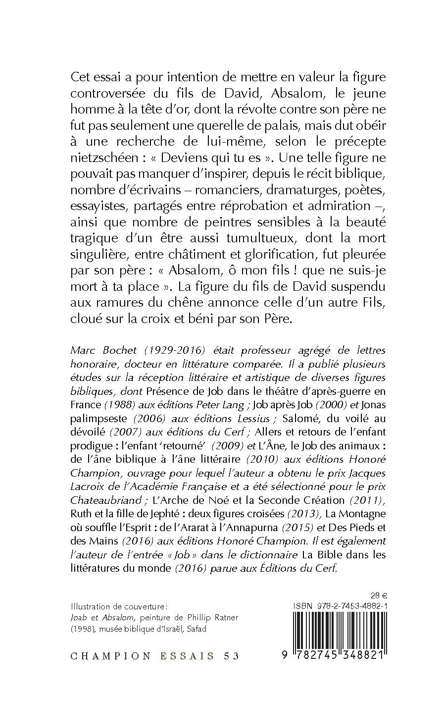 Cet essai a pour intention de mettre en valeur la figure controversée du fils de David, Absalom, le jeune homme à la tête d’or, dont la révolte contre son père ne fut pas seulement une querelle de palais, mais dut obéir à une recherche de lui-même, selon le précepte nietzschéen : « Deviens qui tu es ». Une telle figure ne pouvait pas manquer d’inspirer, depuis le récit biblique, nombre d’écrivains – romanciers, dramaturges, poètes, essayistes, partagés entre réprobation et admiration –, ainsi que nombre de peintres sensibles à la beauté tragique d’un être aussi tumultueux, dont la mort singulière, entre châtiment et glorification, fut pleurée par son père : « Absalom, ô mon fils ! que ne suis-je mort à ta place ». La figure du fils de David suspendu aux ramures du chêne annonce celle d’un autre Fils, cloué sur la croix et béni par son Père.
