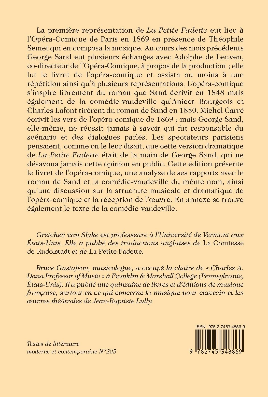 La première représentation de La Petite Fadette eut lieu à l’Opéra-Comique de Paris en 1869 en présence de Théophile Semet qui en composa la musique. Au cours des mois précédents George Sand eut plusieurs échanges avec Adolphe de Leuven, co-directeur de l’Opéra-Comique, à propos de la production ; elle lut le livret de l’opéra-comique et assista au moins à une répétition ainsi qu’à plusieurs représentations. L’opéra-comique s’inspire librement du roman que Sand écrivit en 1848 mais également de la comédie-vaudeville qu’Anicet Bourgeois et Charles Lafont tirèrent du roman de Sand en 1850. Michel Carré écrivit les vers de l’opéra-comique de 1869 ; mais George Sand, elle-même, ne réussit jamais à savoir qui fut responsable du scénario et des dialogues parlés. Les spectateurs parisiens pensaient, comme on le leur disait, que cette version dramatique de La Petite Fadette était de la main de George Sand, qui ne désavoua jamais cette opinion en public. Cette édition présente le livret de l’opéra-comique, une analyse de ses rapports avec le roman de Sand et la comédie-vaudeville du même nom, ainsi qu’une discussion sur la structure musicale et dramatique de l’opéra-comique et la réception de l’oeuvre. En annexe se trouve également le texte de la comédie-vaudeville.