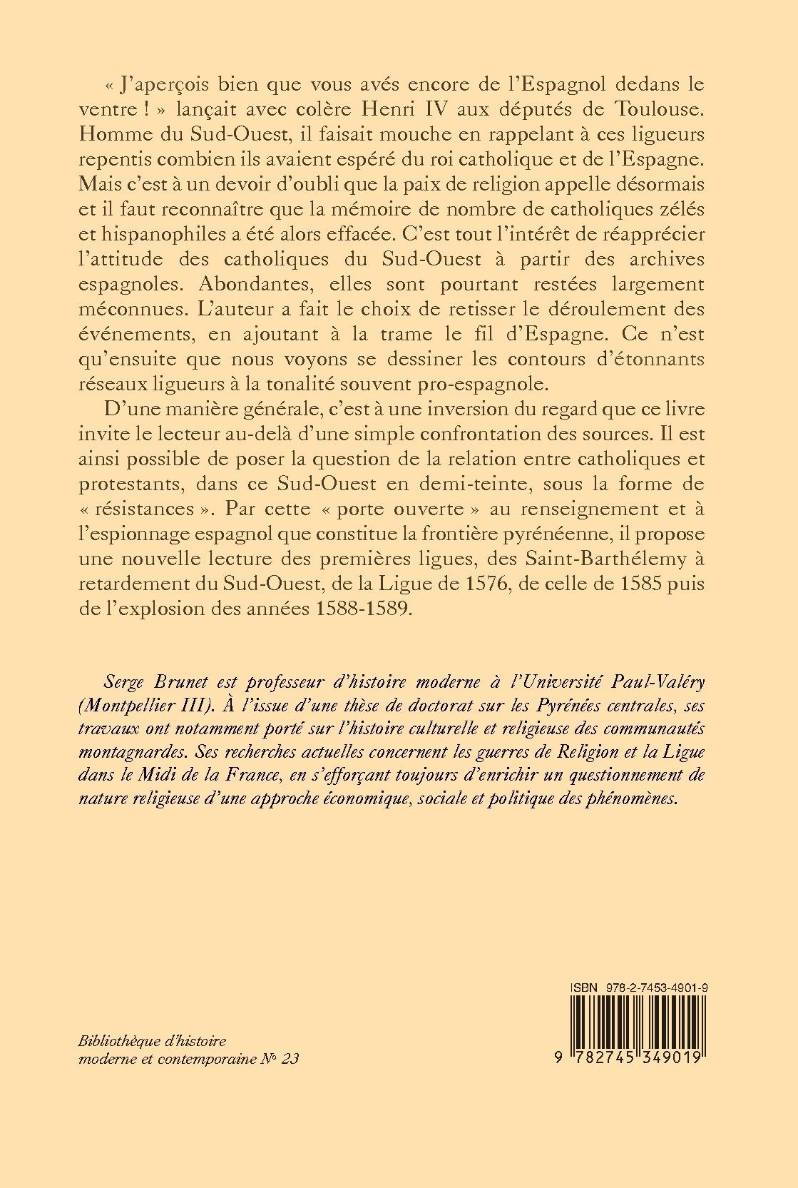 « J’aperçois bien que vous avés encore de l’Espagnol dedans le ventre ! » lançait avec colère Henri IV aux députés de Toulouse. Homme du Sud-Ouest, il faisait mouche en rappelant à ces ligueurs repentis combien ils avaient espéré du roi catholique et de l’Espagne. Mais c’est à un devoir d’oubli que la paix de religion appelle désormais et il faut reconnaître que la mémoire de nombre de catholiques zélés et hispanophiles a été alors effacée. C’est tout l’intérêt de réapprécier l’attitude des catholiques du Sud-Ouest à partir des archives espagnoles. Abondantes, elles sont pourtant restées largement méconnues. L’auteur a fait le choix de retisser le déroulement des événements, en ajoutant à la trame le fil d’Espagne. Ce n’est qu’ensuite que nous voyons se dessiner les contours d’étonnants réseaux ligueurs à la tonalité souvent pro-espagnole.