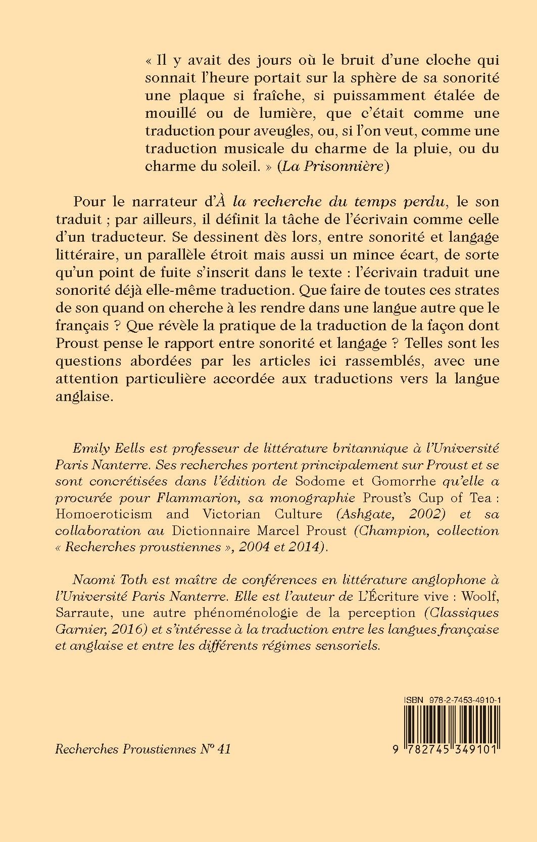 Pour le narrateur d’À la recherche du temps perdu, le son traduit ; par ailleurs, il définit la tâche de l’écrivain comme celle d’un traducteur. Se dessinent dès lors, entre sonorité et langage littéraire, un parallèle étroit mais aussi un mince écart, de sorte qu’un point de fuite s’inscrit dans le texte : l’écrivain traduit une sonorité déjà elle-même traduction. Que faire de toutes ces strates de son quand on cherche à les rendre dans une langue autre que le français ? Que révèle la pratique de la traduction de la façon dont Proust pense le rapport entre sonorité et langage ? Telles sont les questions abordées par les articles ici rassemblés, avec une attention particulière accordée aux traductions vers la langue anglaise.