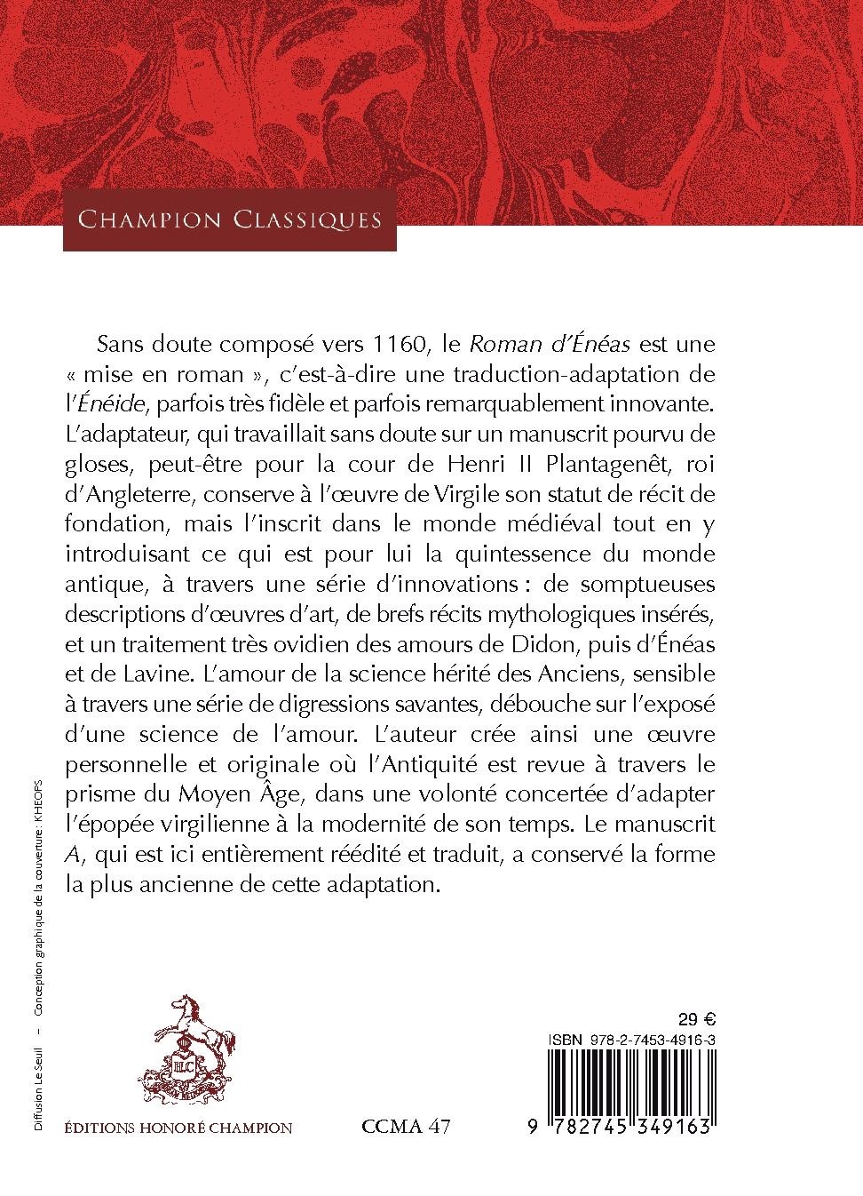Sans doute composé vers 1160, le Roman d’Énéas est une « mise en roman », c’est-à-dire une traduction-adaptation de l’Énéide, parfois très fidèle et parfois remarquablement innovante. L’adaptateur, qui travaillait sans doute sur un manuscrit pourvu de gloses, peut-être pour la cour de Henri II Plantagenêt, roi d’Angleterre, conserve à l’oeuvre de Virgile son statut de récit de fondation, mais l’inscrit dans le monde médiéval tout en y introduisant ce qui est pour lui la quintessence du monde antique, à travers une série d’innovations : de somptueuses descriptions d’œuvres d’art, de brefs récits mythologiques insérés, et un traitement très ovidien des amours de Didon, puis d’Énéas et de Lavine. L’amour de la science hérité des Anciens, sensible à travers une série de digressions savantes, débouche sur l’exposé d’une science de l’amour. L’auteur crée ainsi une oeuvre personnelle et originale où l’Antiquité est revue à travers le prisme du Moyen Âge, dans une volonté concertée d’adapter l’épopée virgilienne à la modernité de son temps. Le manuscrit A, qui est ici entièrement réédité et traduit, a conservé la forme la plus ancienne de cette adaptation.