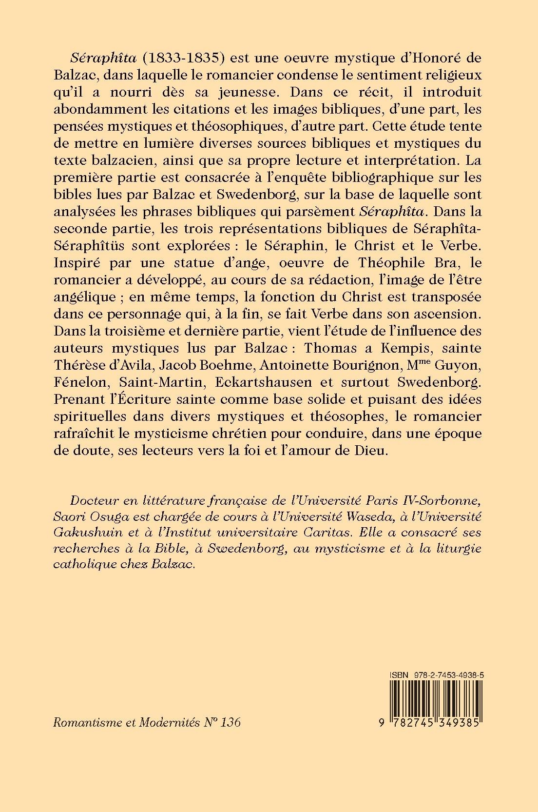 Séraphîta (1833-1835) est une oeuvre mystique d’Honoré de Balzac, dans laquelle le romancier condense le sentiment religieux qu’il a nourri dès sa jeunesse. Dans ce récit, il introduit abondamment les citations et les images bibliques, d’une part, les pensées mystiques et théosophiques, d’autre part. Cette étude tente de mettre en lumière diverses sources bibliques et mystiques du texte balzacien, ainsi que sa propre lecture et interprétation. La première partie est consacrée à l’enquête bibliographique sur les bibles lues par Balzac et Swedenborg, sur la base de laquelle sont analysées les phrases bibliques qui parsèment Séraphîta. Dans la seconde partie, les trois représentations bibliques de Séraphîta-Séraphîtüs sont explorées : le Séraphin, le Christ et le Verbe. Inspiré par une statue d’ange, oeuvre de Théophile Bra, le romancier a développé, au cours de sa rédaction, l’image de l’être angélique ; en même temps, la fonction du Christ est transposée dans ce personnage qui, à la fin, se fait Verbe dans son ascension. Dans la troisième et dernière partie, vient l’étude de l’influence des auteurs mystiques lus par Balzac : Thomas a Kempis, sainte Thérèse d’Avila, Jacob Boehme, Antoinette Bourignon, Mme Guyon, Fénelon, Saint-Martin, Eckartshausen et surtout Swedenborg. Prenant l’Écriture sainte comme base solide et puisant des idées spirituelles dans divers mystiques et théosophes, le romancier rafraîchit le mysticisme chrétien pour conduire, dans une époque de doute, ses lecteurs vers la foi et l’amour de Dieu.