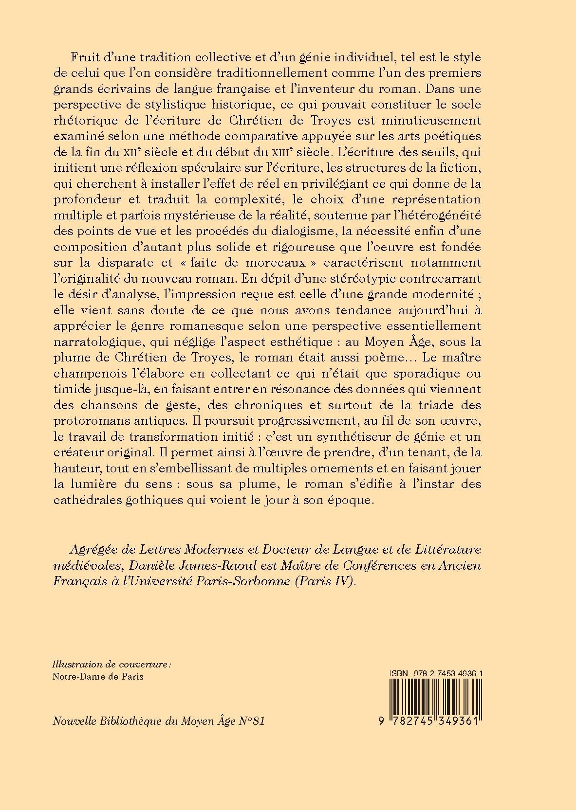 Fruit d’une tradition collective et d’un génie individuel, tel est le style de celui que l’on considère traditionnellement comme l’un des premiers grands écrivains de langue française et l’inventeur du roman. Dans une perspective de stylistique historique, ce qui pouvait constituer le socle rhétorique de l’écriture de Chrétien de Troyes est minutieusement examiné selon une méthode comparative appuyée sur les arts poétiques de la fin du XIIe siècle et du début du XIIIe siècle. L’écriture des seuils, qui initient une réflexion spéculaire sur l’écriture, les structures de la fiction, qui cherchent à installer l’effet de réel en privilégiant ce qui donne de la profondeur et traduit la complexité, le choix d’une représentation multiple et parfois mystérieuse de la réalité, soutenue par l’hétérogénéité des points de vue et les procédés du dialogisme, la nécessité enfin d’une composition d’autant plus solide et rigoureuse que l’oeuvre est fondée sur la disparate et « faite de morceaux » caractérisent notamment l’originalité du nouveau roman. En dépit d’une stéréotypie contrecarrant le désir d’analyse, l’impression reçue est celle d’une grande modernité ; elle vient sans doute de ce que nous avons tendance aujourd’hui à apprécier le genre romanesque selon une perspective essentiellement narratologique, qui néglige l’aspect esthétique : au Moyen Âge, sous la plume de Chrétien de Troyes, le roman était aussi poème… Le maître champenois l’élabore en collectant ce qui n’était que sporadique ou timide jusque-là, en faisant entrer en résonance des données qui viennent des chansons de geste, des chroniques et surtout de la triade des protoromans antiques. Il poursuit progressivement, au fil de son œuvre, le travail de transformation initié : c’est un synthétiseur de génie et un créateur original. Il permet ainsi à l’œuvre de prendre, d’un tenant, de la hauteur, tout en s’embellissant de multiples ornements et en faisant jouer la lumière du sens : sous sa plume, le roman s’édifie à l’instar des cathédrales gothiques qui voient le jour à son époque.