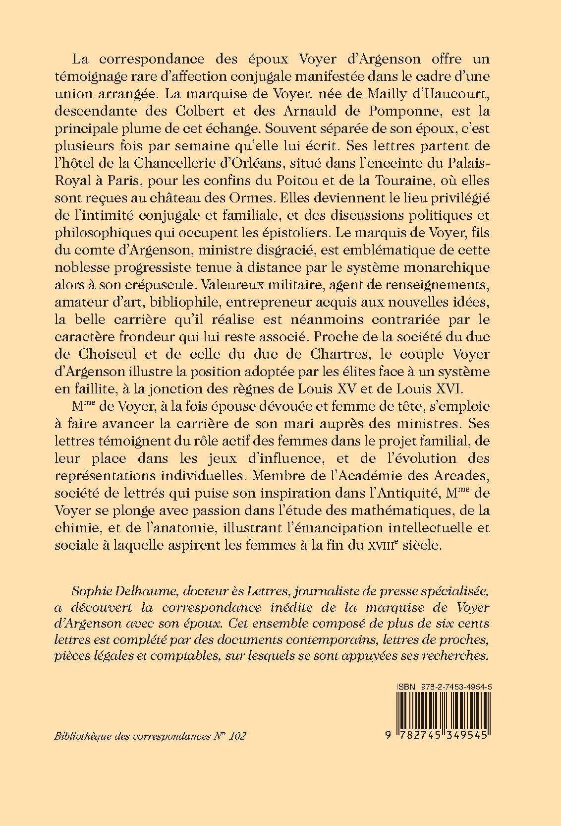 La correspondance des époux Voyer d’Argenson offre un témoignage rare d’affection conjugale manifestée dans le cadre d’une union arrangée. La marquise de Voyer, née de Mailly d’Haucourt, descendante des Colbert et des Arnauld de Pomponne, est la principale plume de cet échange. Souvent séparée de son époux, c’est plusieurs fois par semaine qu’elle lui écrit. Ses lettres partent de l’hôtel de la Chancellerie d’Orléans, situé dans l’enceinte du Palais- Royal à Paris, pour les confins du Poitou et de la Touraine, où elles sont reçues au château des Ormes. Elles deviennent le lieu privilégié de l’intimité conjugale et familiale, et des discussions politiques et philosophiques qui occupent les épistoliers. Le marquis de Voyer, fils du comte d’Argenson, ministre disgracié, est emblématique de cette noblesse progressiste tenue à distance par le système monarchique alors à son crépuscule. Valeureux militaire, agent de renseignements, amateur d’art, bibliophile, entrepreneur acquis aux nouvelles idées, la belle carrière qu’il réalise est néanmoins contrariée par le caractère frondeur qui lui reste associé. Proche de la société du duc de Choiseul et de celle du duc de Chartres, le couple Voyer d’Argenson illustre la position adoptée par les élites face à un système en faillite, à la jonction des règnes de Louis XV et de Louis XVI.
