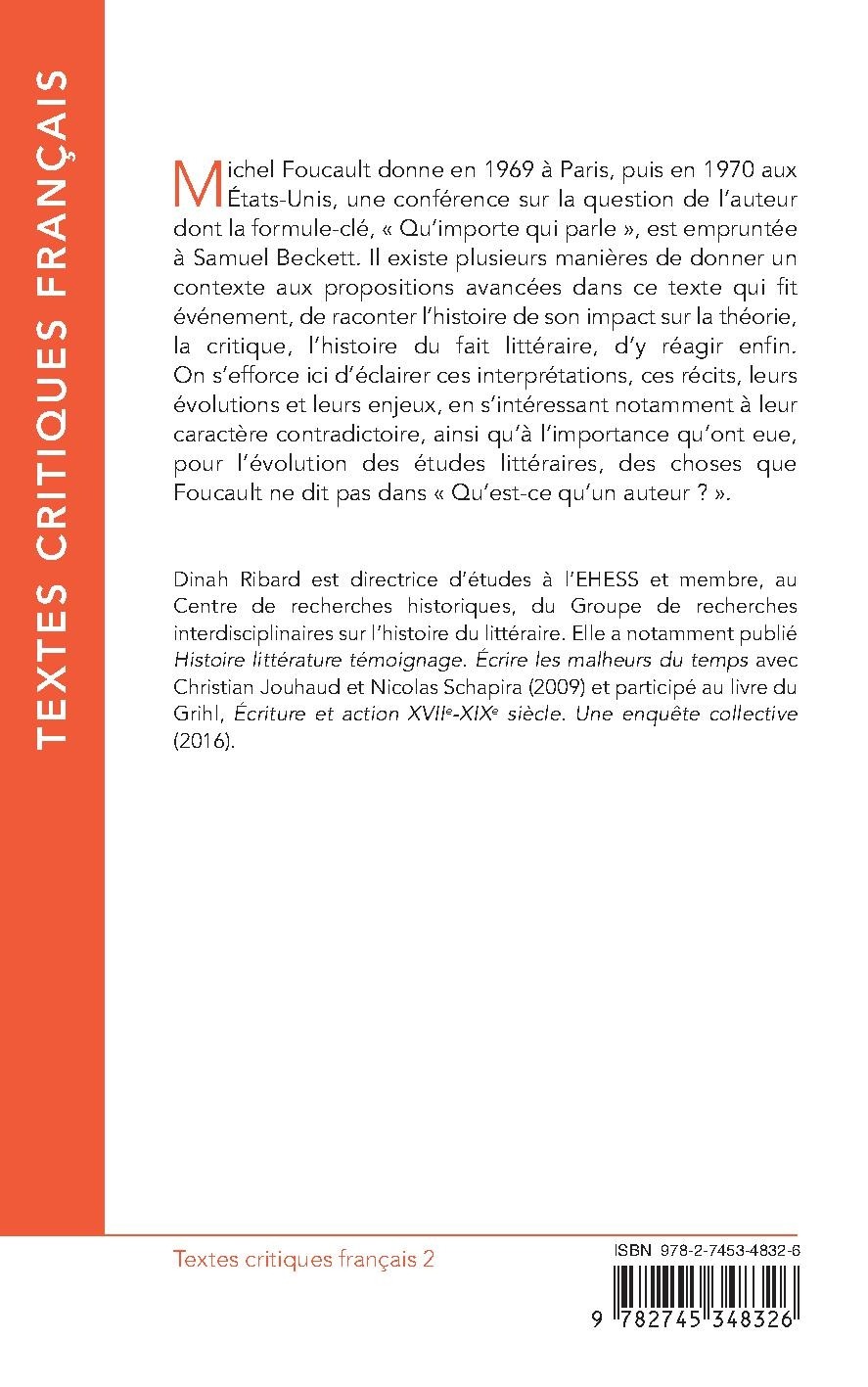 Michel Foucault donne en 1969 à Paris, puis en 1970 aux États-Unis, une conférence sur la question de l’auteur dont la formule-clé, « Qu’importe qui parle », est empruntée à Samuel Beckett. Il existe plusieurs manières de donner un contexte aux propositions avancées dans ce texte qui fit événement, de raconter l’histoire de son impact sur la théorie, la critique, l’histoire du fait littéraire, d’y réagir enfin. On s’efforce ici d’éclairer ces interprétations, ces récits, leurs évolutions et leurs enjeux, en s’intéressant notamment à leur caractère contradictoire, ainsi qu’à l’importance qu’ont eue, pour l’évolution des études littéraires, des choses que Foucault ne dit pas dans « Qu’est-ce qu’un auteur ? ».