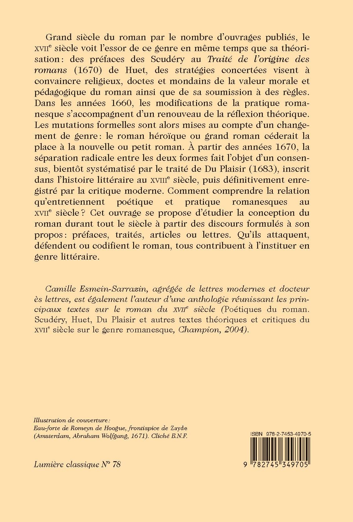 Grand siècle du roman par le nombre d’ouvrages publiés, le XVIIe siècle voit l’essor de ce genre en même temps que sa théorisation : des préfaces des Scudéry au Traité de l’origine des romans (1670) de Huet, des stratégies concertées visent à convaincre religieux, doctes et mondains de la valeur morale et pédagogique du roman ainsi que de sa soumission à des règles. Dans les années 1660, les modifications de la pratique romanesque s’accompagnent d’un renouveau de la réflexion théorique. Les mutations formelles sont alors mises au compte d’un changement de genre : le roman héroïque ou grand roman céderait la place à la nouvelle ou petit roman. À partir des années 1670, la séparation radicale entre les deux formes fait l’objet d’un consensus, bientôt systématisé par le traité de Du Plaisir (1683), inscrit dans l’histoire littéraire au XVIIIe siècle, puis définitivement enregistré par la critique moderne. Comment comprendre la relation qu’entretiennent poétique et pratique romanesques au XVIIe siècle ? Cet ouvrage se propose d’étudier la conception du roman durant tout le siècle à partir des discours formulés à son propos : préfaces, traités, articles ou lettres. Qu’ils attaquent, défendent ou codifient le roman, tous contribuent à l’instituer en genre littéraire.