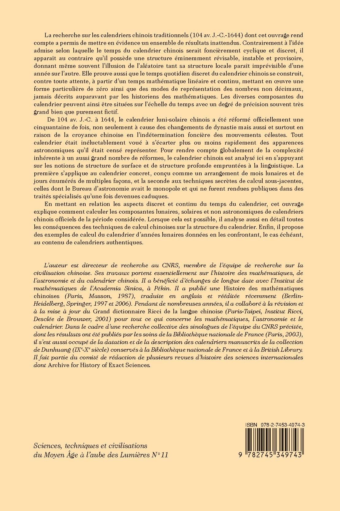 L’auteur est directeur de recherche au CNRS, membre de l’équipe de recherche sur la civilisation chinoise. Ses travaux portent essentiellement sur l’histoire des mathématiques, de l’astronomie et du calendrier chinois. Il a bénéficié d’échanges de longue date avec l’Institut de mathématiques de l’Academia Sinica, à Pékin. Il a publié une Histoire des mathématiques chinoises (Paris, Masson, 1987), traduite en anglais et rééditée récemment (Berlin- Heidelberg, Springer, 1997 et 2006). Pendant de nombreuses années, il a collaboré à la révision et à la mise à jour du Grand dictionnaire Ricci de la langue chinoise (Paris-Taipei, Institut Ricci, Desclée de Brouwer, 2001) pour tout ce qui concerne les mathématiques, l’astronomie et le calendrier. Dans le cadre d’une recherche collective des sinologues de l’équipe du CNRS précitée, dont les résultats ont été publiés par les soins de la Bibliothèque nationale de France (Paris, 2003), il s’est aussi occupé de la datation et de la description des calendriers manuscrits de la collection de Dunhuang (IXe-Xe siècle) conservés à la Bibliothèque nationale de France et à la British Library. Il fait partie du comité de rédaction de plusieurs revues d’histoire des sciences internationales dont Archive for History of Exact Sciences.