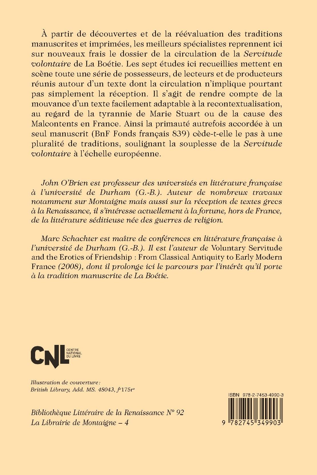 À partir de découvertes et de la réévaluation des traditions manuscrites et imprimées, les meilleurs spécialistes reprennent ici sur nouveaux frais le dossier de la circulation de la Servitude volontaire de La Boétie. Les sept études ici recueillies mettent en scène toute une série de possesseurs, de lecteurs et de producteurs réunis autour d’un texte dont la circulation n’implique pourtant pas simplement la réception. Il s’agit de rendre compte de la mouvance d’un texte facilement adaptable à la recontextualisation, au regard de la tyrannie de Marie Stuart ou de la cause des Malcontents en France. Ainsi la primauté autrefois accordée à un seul manuscrit (BnF Fonds français 839) cède-t-elle le pas à une pluralité de traditions, soulignant la souplesse de la Servitude volontaire à l’échelle européenne.